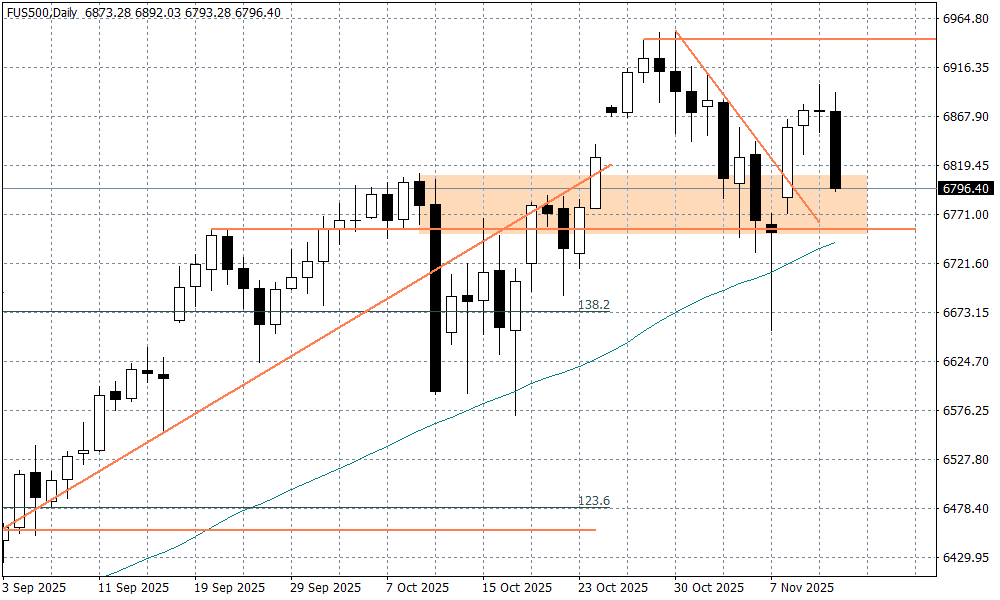W przypadku futures na S&P500 mamy silne zawrócenie w dół, co może sugerować, że ostatnie odbicie było tylko ruchem korekcyjnym w strukturze spadkowej rozpoczętej w końcu października b.r.