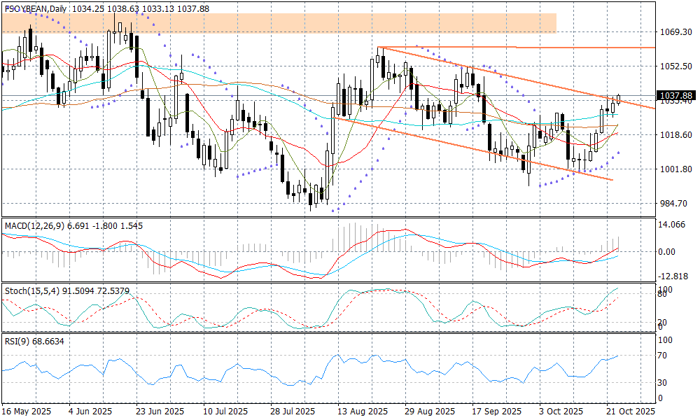 Przed zaplanowanym na przyszły tydzień spotkaniem nowej premier Japonii (Takaichi) z Donaldem Trumpem, w mediach pojawiają się opinie, że Japończycy na "zachętę" mogliby zdecydować się na zakupy amerykańskich ciężarówek, gazu, ale i też soji, która obecnie jest głównie importowana z Brazylii. Tymczasem kontrakty na amerykańską soję kontynuują zwyżkę opuszczając tym samym kanał spadkowy. Rynek "ufa" słowom Donalda Trumpa, który przy każdej okazji zapewnia, że temat zakupów soji przez Chiny będzie jednym z kluczowych podczas jego spotkania z Xi Jinpingiem w przyszłym tygodniu.