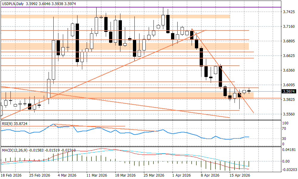 Złoty nieznacznie się osłabił w poniedziałek rano w ślad za podbiciem awersji do ryzyka po doniesieniach z Bliskiego Wschodu. Wbrew informacjom z piątkowego popołudnia, cieśnina Ormuz nie została jednak otwarta. Iran oskarżył USA o dalsze blokowanie przez USA żeglugi do irańskich portów, oraz niechęć do odmrożenia zagranicznych aktywów, co miało być elementem porozumienia obejmującego memorandum na wzbogacanie uranu. Jednocześnie reżim w Teheranie nie chce zgodzić się na oddanie zapasów tego surowca do USA. Kruchy rozejm (kończy się w środę) stanął pod znakiem zapytania, chociaż strony nie wyraźnie nie zaprzeczyły doniesieniom, że we wtorek zostaną wznowione negocjacje w pakistańskim Islamabadzie - dzisiaj wieczorem ma przybyć delegacja USA z wiceprezydentem J.D.Vance'm. Dlatego też rynek traktuje ostatnie doniesienia, jako "kontrolowaną eskalację" w ramach procesu negocjacji, a nie sygnał, że wojna zostanie wznowiona w środę. Niemniej, gdyby pojawiły się informacje, że jutro jednak żadnych rozmów w Pakistanie nie będzie, to może zrobić się bardziej nerwowo.