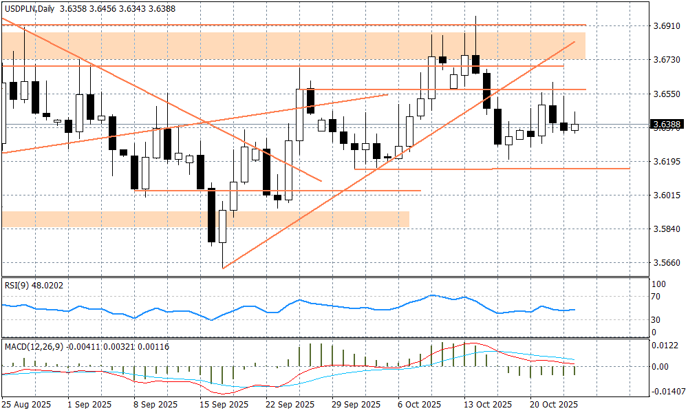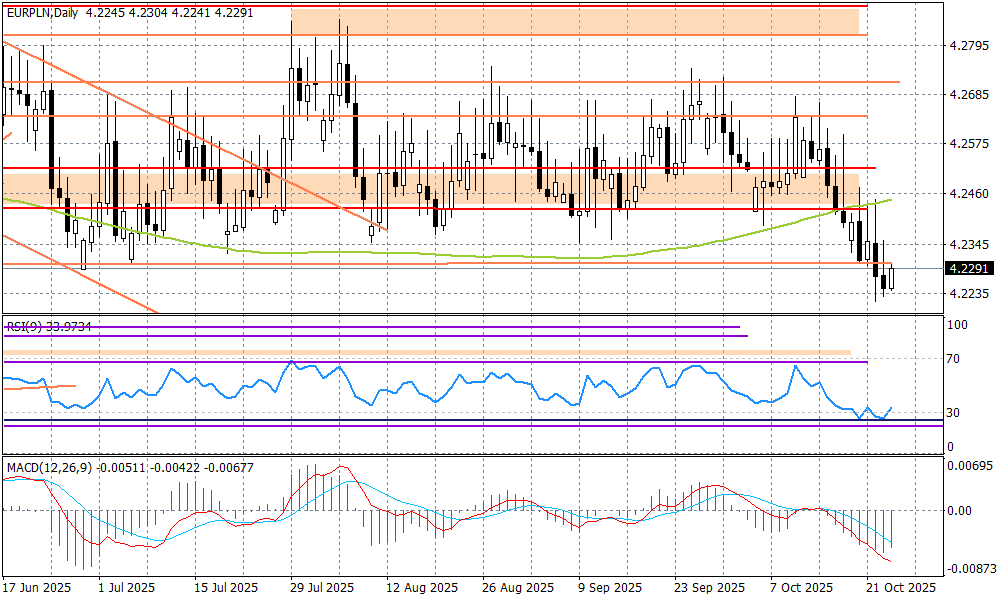 Dzisiaj w kalendarzu makro dla Polski jest pusto, ale inwestorzy powinni pozytywnie odebrać opublikowane szacunki indeksów PMI dla Niemiec, które w październiku pobiły oczekiwania. Poza tym zobaczymy dane o inflacji CPI z USA, ale i też odczyt PMI, oraz nastrojów konsumenckich. Zwłaszcza, spóźniona inflacja CPI (poznamy ją o godz. 14:30) może mieć znaczenie dla szacowanej przez rynki ścieżki oczekiwanych ruchów FED (przyszłotygodniowa obniżka jest bezdyskusyjna). Technicznie warto będzie zerkać na ruchy EURUSD, który rysuje sygnały do krótkoterminowego odbicia z okolic 1,1572-1,1600, co może zaważyć na USDPLN.
