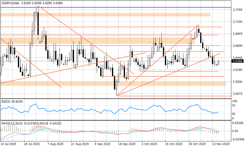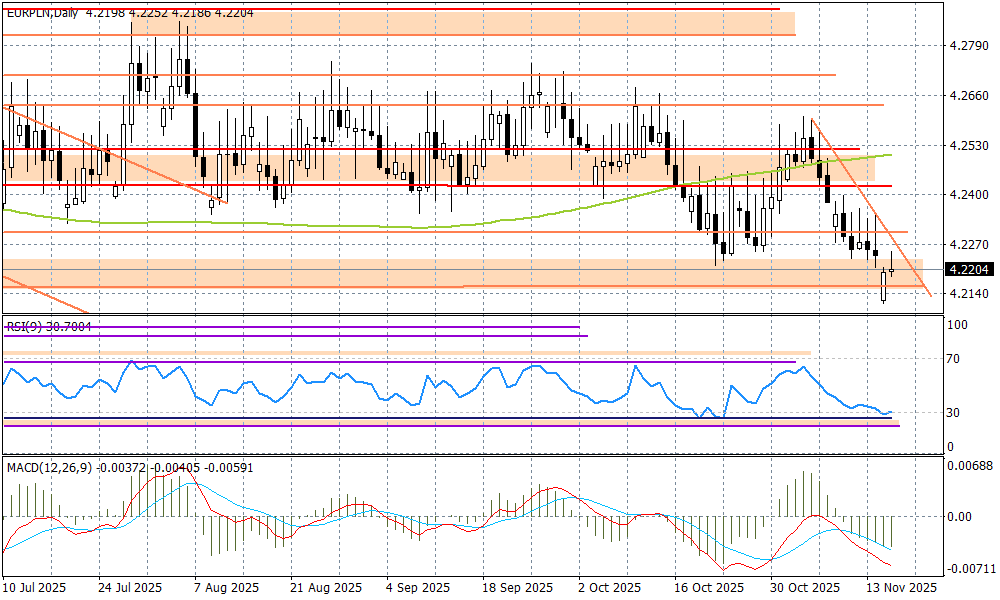 Polska waluta radzi sobie dość dobrze, jeżeli popatrzymy na negatywne emocje na Wall Street, czy rynku kryptowalut. Pośrednio jest tak za sprawą słabości dolara (EURUSD choć próbował zejść poniżej 1,16, to pozostaje ponad tym poziomem), ale na spory plus wyróżniają się krajowe dane makro (PKB w III kwartale wzrósł o 3,7 proc. r/r jak podał w zeszłym tygodniu GUS), oraz perspektywa końca obniżek stóp procentowych przez RPP. Przy czym nie chodzi tu o czas, a bardziej poziom. Wypowiedzi prezesa Glapińskiego po ostatnim posiedzeniu wskazujące, że do tzw. poziomu neutralnego jest już niedaleko, oraz wspomniane niezłe dane o koniunkturze w gospodarce, to sygnał, że rynek może co najwyżej liczyć na maksymalnie dwie obniżki stóp do wakacji 2026 r., a być może zobaczymy tylko jeden ruch pod koniec I kwartału. Oczywiście te szacunki mogą zmienić się chociażby w wyniku pojawienia się niekorzystnych sygnałów w europejskiej gospodarce, czy też czynników geopolitycznych, które zwyczajowo wymykają się racjonalnemu prognozowaniu, ale na obecną chwilę zdaje się to tak wyglądać i reakcja rynków jest taka, jak widać.