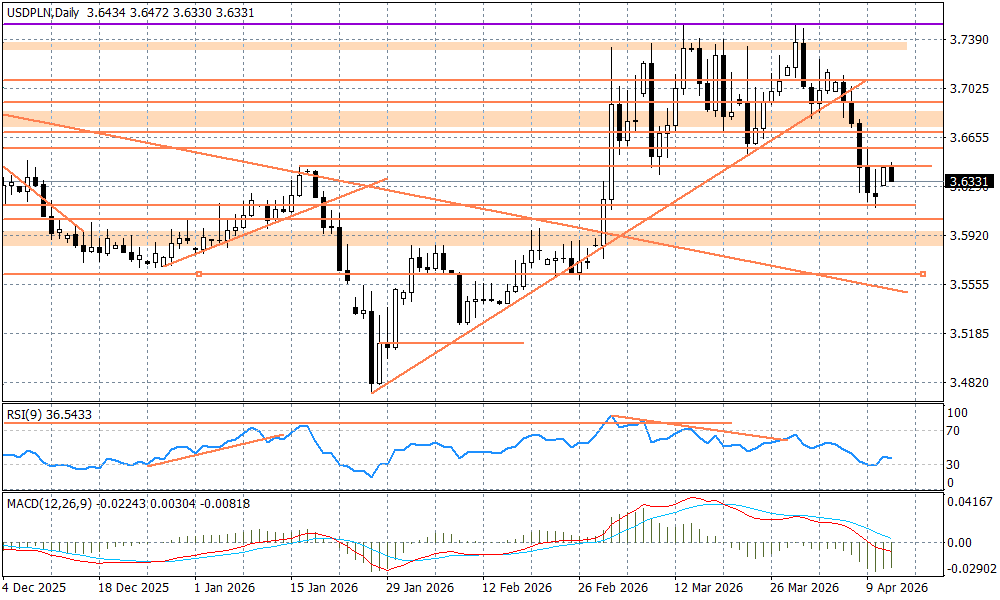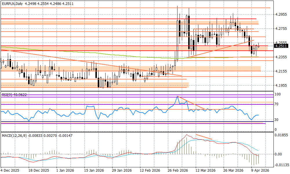 Słabość złotego w kontekście informacji z Bliskiego Wschodu jest jednak mało widoczna - EURPLN oscyluje wokół 4,25, a USDPLN 3,6350. Niewykluczone, że złoty w kolejnych godzinach zyska na fali optymizmu wokół Węgier, jeżeli wieczorem nie dojdzie do jakichś istotnych prowokacji w Cieśninie Ormuz. Dzisiaj w kalendarzu mamy dane NBP o bilansie płatniczym za luty, oraz zapiski z marcowego posiedzenia RPP, ale obecnie są to mało istotne rzeczy. W tym tygodniu istotniejsze będą finalne dane o inflacji CPI (we wtorek 14 kwietnia) i odczyty inflacji bazowej CPI (w czwartek 16 kwietnia).