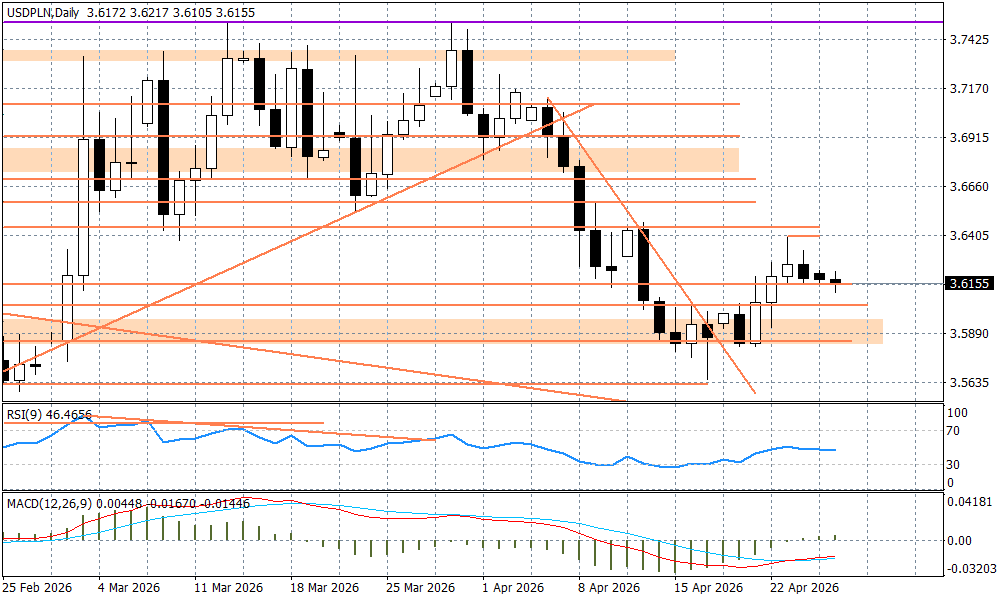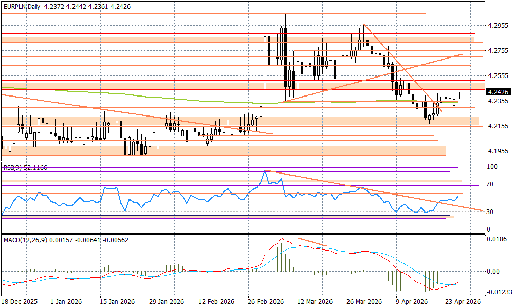 Poniedziałek przynosi nieznaczne osłabienie złotego - EURPLN drożeje do 4,2430, a USDPLN stabilizuje się wokół 3,6170. Sytuacja ma miejsce przy lekko rosnącym EURUSD (do1,1730), co może wskazywać na utrzymujące się napięcia na rynkach. Nadal problematyczna pozostaje sytuacja na Bliskim Wschodzie, gdzie to Iran zdaje się mieć przewagę eskalacyjną w tym konflikcie. Planowane negocjacje w Islamabadzie nie doszły do skutku, a władze w Teheranie przedstawiły własny plan obejmujący trzy etapy - pierwszy zakończenie wojny i gwarancje bezpieczeństwa, drugi to rozmowy o odblokowaniu cieśniny Ormuz, trzeci to dyskusja o wątku rozbrojenia nuklearnego. Donald Trump stanowczo odrzuca tą formułę, a USA twierdzą, że ich blokada Ormuzu pozostaje elementem presji na Iran, który "nie ma kart". Sytuacja jednak pozostaje patowa, ale lekko pozytywna reakcja na doniesienia o irańskiej propozycji pokojowej może świadczyć o tym, że inwestorzy są po prostu zmęczeni całą sytuacją i kupią każdy scenariusz pokojowy. Być może nawet ten, który dopuszczałby pobieranie myta przez Iran za żeglugę przez Ormuz. Zgoda USA na takie rozwiązania jest jednak mało prawdopodobna - dzisiaj po południu Donald Trump ma szczegółowo umówić całą sytuację ze swoimi doradcami i poinformować o dalszych działaniach. Szanse na kompromis są kruche, co może wpływać na nastroje. Jednak to ile warte są ustalenia poczynione przez prezydenta USA świadczy to, że wynegocjowany kilka dni temu rozejm pomiędzy Izraelem, a Libanem jest już historią (a miał trwać trzy tygodnie).