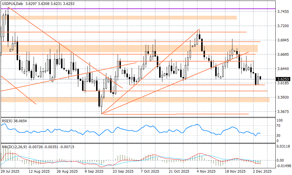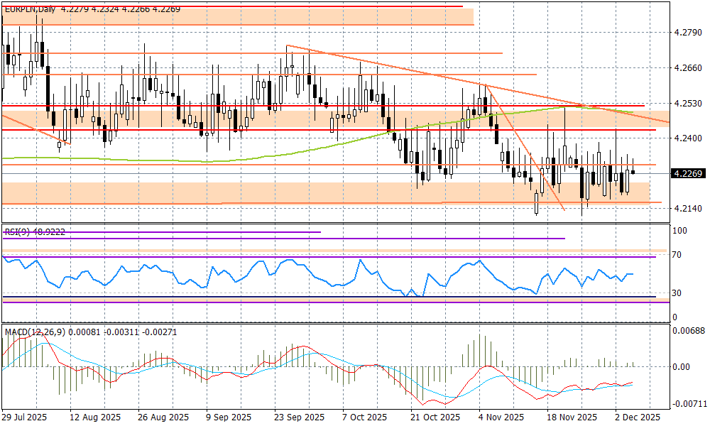 Na rynku złotego wiele się nie dzieje. Para EURPLN nie zareagowała zbytnio na cięcie stóp przez RPP w środę o 25 punktów baz. do 4,00 proc., ani też wczorajszą konferencję prasową prezesa Glapińskiego, którą można streścić zdaniem "możemy dalej ciąć stopy, zerkamy na dane, ale przestrzeń do większego ruchu nie jest duża". Tymczasem oczekiwania rynkowe dopuszczają w przyszłym roku przestrzeń do zejścia nawet o 100 punktów baz. do 3,00 proc. w okolicach października 2026 r. Wydaje się jednak, że rynek wróci szerzej do dyskusji na ten temat na początku przyszłego roku, tymczasem w grudniu uwagę bardziej skupią wydarzenia na EURUSD (rzutujące mocniej na USDPLN), oraz doniesienia w temacie pokojowego dla Ukrainy (teraz Rosja rzekomo czeka na odpowiedź USA po spotkaniu Witkoffa z Putinem).