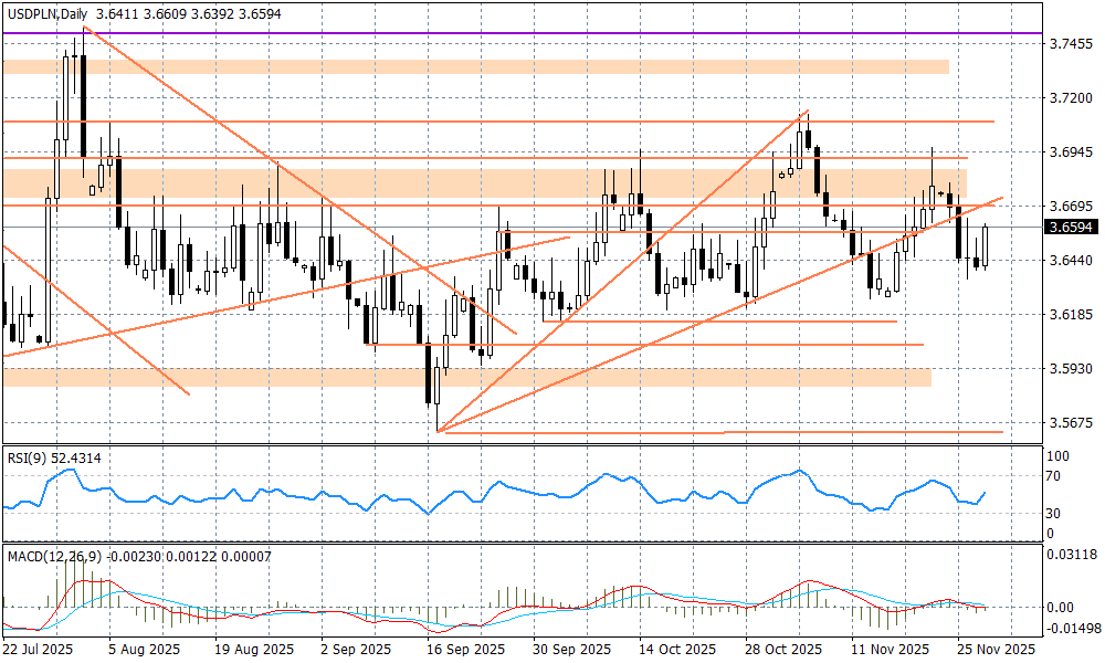 Piątek przynosi lekkie podbicie EURPLN w okolice 4,2350 i USDPLN do 3,6600, co ma miejsce przy relatywnie płytkim rynku - wczoraj Amerykanie świętowali Dzień Dziękczynienia, a dzisiaj rano rynki są mocno ospałe. Czy złoty może się mocniej osłabić, jeżeli rynki wykreślą temat Ukrainy z listy mocnych argumentów, które miały go umocnić? Nie, gdyż dla polskiej waluty istotne są fundamenty makro, a te są dość dobre, na co wskazały dane GUS z tego tygodnia. Gospodarka ma szanse przyspieszyć w IV kwartale (w poprzednim PKB wzrósł o 3,7 proc. r/r), co może za chwilę ograniczać możliwości działań RPP na stopach procentowych mimo malejącej presji inflacyjnej. W grudniu obniżki stóp raczej nie zobaczymy, a do połowy 2026 r. być może zaledwie 1-2 ruchy po czym decydenci przejdą w tryb wyczekiwania i stabilizacji, tak jak to ma miejsce teraz w przypadku Europejskiego Banku Centralnego.