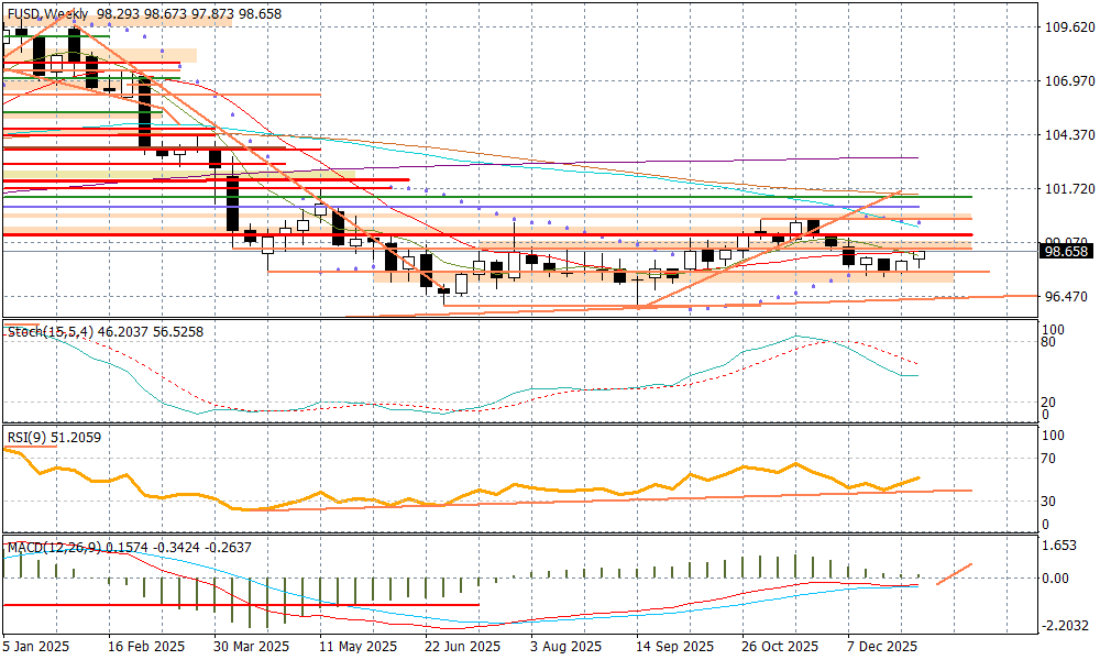 Układ techniczny CFD na futures indeksu dolara może zapowiadać dalsze wzrosty amerykańskiej waluty względem innych. W tym tygodniu mamy szanse (choć jutro jeszcze piątek i to z kluczowymi danymi) na wyrysowanie drugiej świecy wzrostowej, co może sygnalizować koniec trwającej od drugiej połowy listopada do końca grudnia, korekty spadkowej i powrót do trendu wzrostowego zainicjowanego w połowie września.