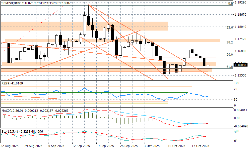 Rynek na Wall Street staje się nieco bardziej nerwowy za sprawą niejasności, co do przyszłotygodniowego spotkania Trumpa z Xi Jinpingiem. Nie przykrywa tego wątek spekulacji wokół zakończenia goverment shutdown, gdyż inwestorzy chcą jakichś konkretów, a nie deklaracji pojedynczych polityków z obozu republikanów. Dodatkowo dzisiaj wieczorem mamy też publikację wyników Tesli, które zwyczajowo podbijają zmienność. To wszystko sprawia, że dolar może nieco się skorygować po ruchu w pierwszej połowie tygodnia. Na EURUSD mamy dzisiaj rysującą się świecę doji z podbiciem istotności wsparcia przy 1,1572.