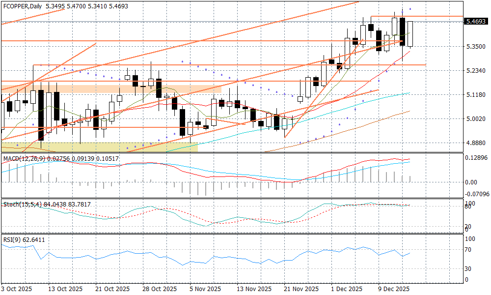 Piątek przyniósł cofnięcie się cen kontraktów na miedź, co korelowało ze słąbością Wall Street i obawami, co do bańki w sektorze AI - tymczasem to zwyżki na miedzi, ale i też srebrze, zaczynają być właśnie z AI mocniej skorelowane. Poniedziałek przynosi odbicie i to pomimo słabych danych z Chin (ceny nieruchomości -2,4 proc. r/r w listopadzie, inwestycje w aglomeracjach -2,6 proc. r/r, produkcja przemysłowa 4,8 proc. r/r, sprzedaż detaliczna tylko 1,3 proc. r/r). Wskazuje się na rolowanie pozycji na kolejne serie, co może wskazywać na to, że inwestorzy dość pozytywnie podchodzą do tego rynku na 2026 r.