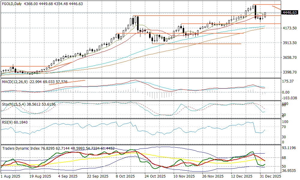 Ceny złota idą dzisiaj mocniej w górę, gdyż rynek dostał preteksty w postaci wzrostu napięć geopolitycznych. Kruszec odreagowuje jednak ostatnią przecenę sprzed Sylwestra i nie jest powiedziane, że jest to powrót do trendu wzrostowego. Ryzyko zatrzymania wokół poziomów ostatnich maksimów przy 4580 USD w kolejnych dniach (futures) jest duże, gdyby dalej widoczna była aprecjacja dolara - zazwyczaj te rynki idą w przeciwnych kierunkach.
