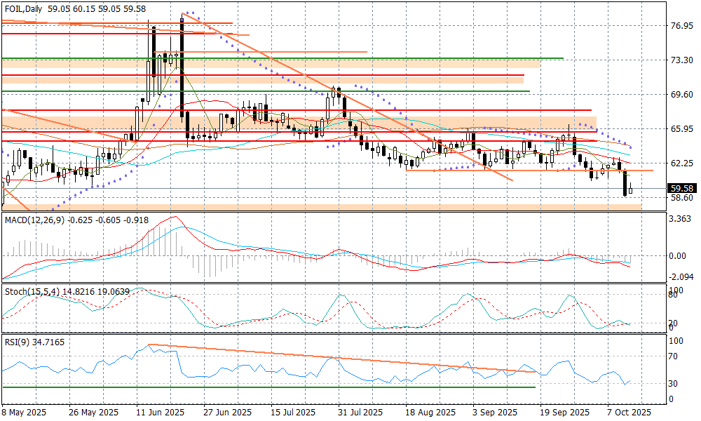 Rynek ropy nieco dzisiaj odreagowuje ostatni spadek, który był wywołany perspektywami uspokojenia się sytuacji na Bliskim Wschodzie - wojna w Strefie Gazy została zakończona - oraz ucieczką inwestorów od ryzykownych aktywów w piątek. Warto jednak mieć na uwadze, że sytuacja w Strefie Gazy miałaby znaczenie dla rynku tylko wtedy, kiedy w konflikt zostałyby wciągnięte inne kraje, a ryzyko takiego scenariusza było i tak nikłe po ostatniej wojnie izraelsko-irańskiej. Tym samym większy wpływ będzie mieć kwestia rozwoju sytuacji wokół eksportu metali ziem z rzadkich z Chin i ewentualnej odpowiedzi USA, gdyż to może zwiększyć obawy o wzrost gospodarczy i tym samym zmniejszyć popyt na ropę. Perspektywy dla odbicia cen ropy są zatem nikłe.