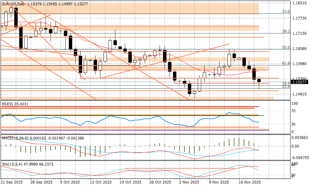 Czy to ten moment? W rannym wpisie wskazywałem na to, że dalsze wzrosty dolara mogą być mało zasadne w sytuacji rosnącej presji w krótkim terminie na realizację zysków z ruchu, jaki miał miejsce w ostatnich dniach, a także w sytuacji, kiedy rynek (na razie) ignoruje to co za kilka tygodni może być istotne, czyli wybór nowego szefa FED przez Trumpa (może być wskazanie na Hassetta), wyrok SCOTUS w sprawie ceł Trumpa (bukmacherzy dają poniżej 25 proc. szans na to, że sędziowie zgodzą się z działaniami prezydenta), ale i też kwestie związane z dostępnością dolarów na rynku międzybankowym i możliwym dostarczeniem płynności przez FED w grudniu po zakończeniu programu QT na początku grudnia.