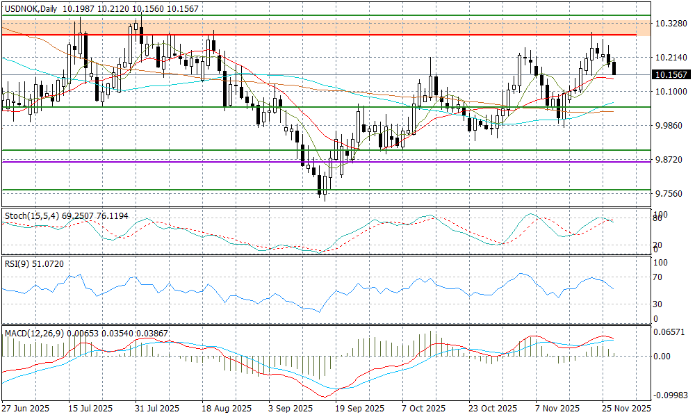 Cofnięcie na USDNOK zbiega się z odbiciem się od istotnej strefy oporu przy 10,30-10,36.