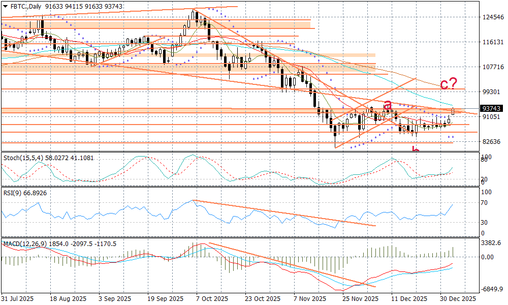 Na razie jednak rynek zdaje się liczyć na realizację fali c na BTC, która byłaby tylko elementem szerszej korekty a-b-c dla ruchu spadkowego rozpoczętego w październiku ub.r. Obecnie jesteśmy już blisko oporów dla fali a tj. rejonu 94700-94900 USD. Kolejna strefa oporu to okolice 99000-100000 USD.