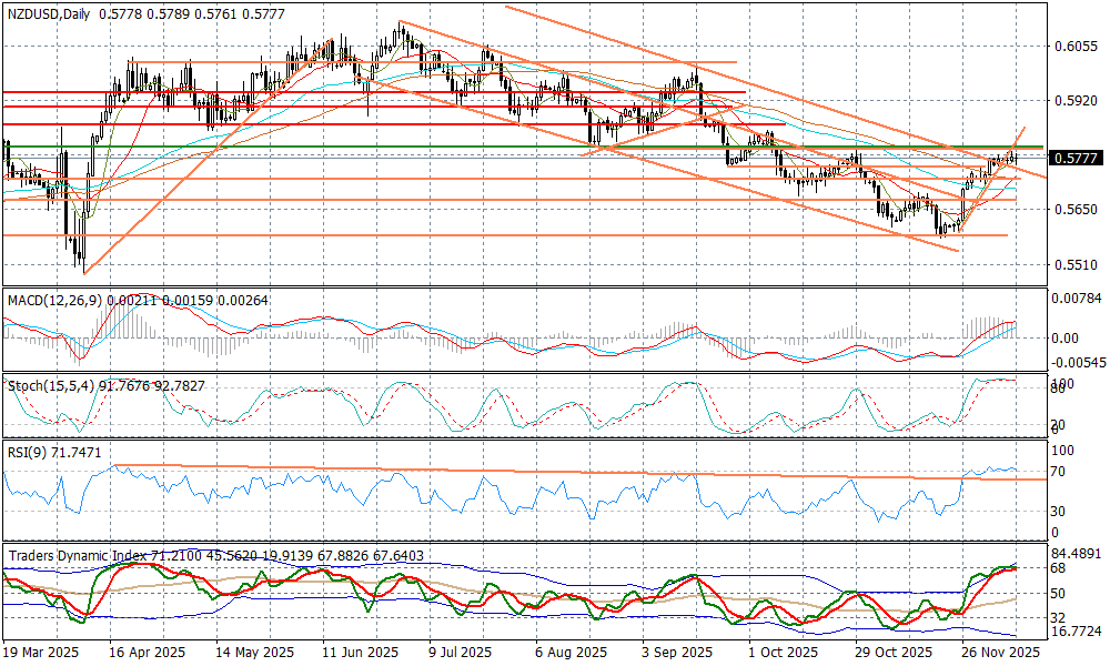 Para NZDUSD, czyli popularne kiwi, to jednak z zachowujących się mocno w ostatnim czasie, obok dolara australijskiego. Obie pary dolarowe łączy jedno - polityka banków centralnych. Wczoraj mieliśmy "jastrzębi" przekaz z RBA z podbiciem oczekiwań na podwyżki stóp w 2026 r. (rynek zaczął wyceniać nawet dwie po 25 punktów baz.), dzisiaj agencje cytowały słowa nowej prezeski RBNZ (Breman), która dała do zrozumienia, że bank centralny osiągnął swoje cele i teraz będzie działać w oparciu o bieżące dane. Rynki wyceniają ponad dwie podwyżki w 2026 r. (62 punkty baz. do grudnia), choć pierwsza byłaby możliwa nie wcześniej, niż maju.