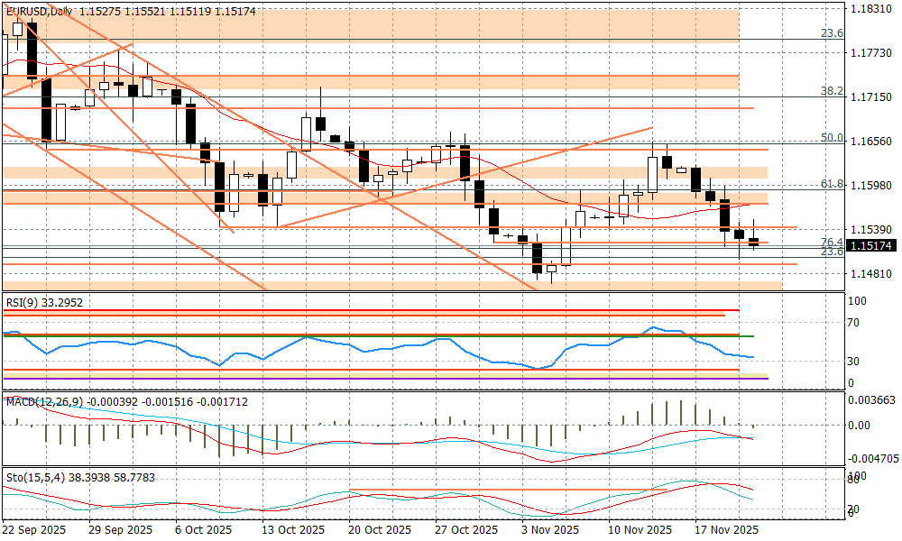 Dzisiaj rano spłynęły szacunki dla indeksów PMI za listopad w strefie euro. Mamy słabszy przemysł (znów poniżej 50 pkt., a dokładnie 49,7 pkt.), oraz minimalnie lepsze usługi (53,1 pkt.). Wnioski są takie, że europejska gospodarka bardziej dryfuje niż się rozwija, a wyzwania globalne są nadal dużym obciążeniem. To dla polityki ECB nie znaczy wiele, choć dryf oznacza bardziej stagnację w odczytach inflacji i może stworzyć jakieś pole dla ruchu ECB na stopach w połowie 2026 r. Ale teraz to nie jest przedmiotem do rozważań, a EURUSD pozostanie pod wpływem globalnych emocji związanych z kolejną falą risk-off. Ostatnie kilkanaście godzin pokazało, że inwestorzy nie traktują dolara jako safe haven.