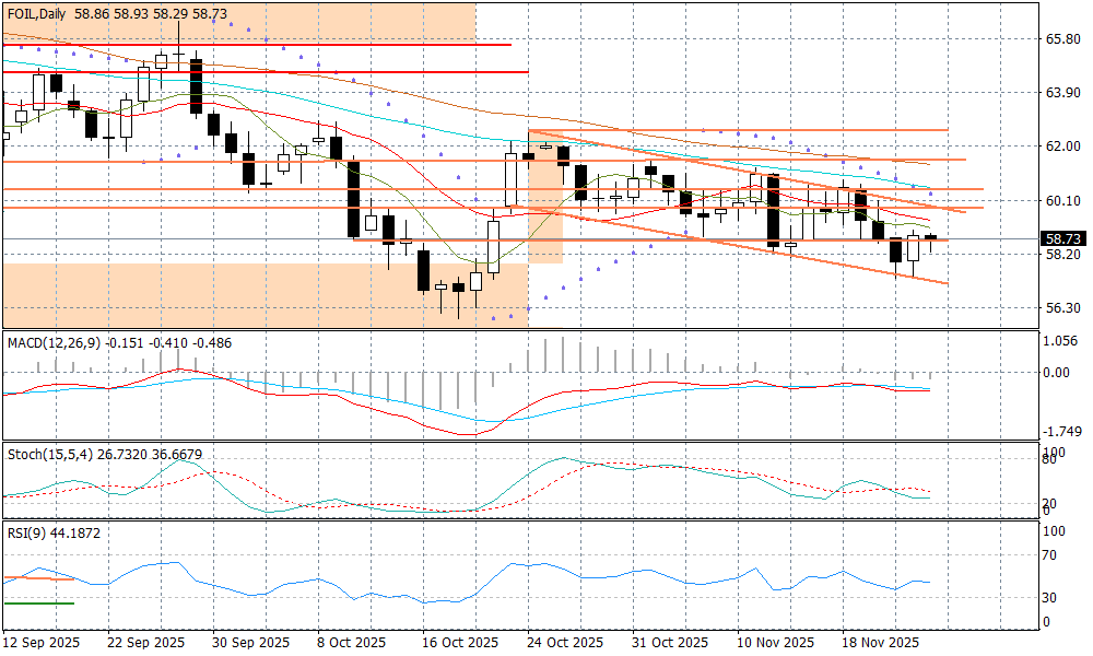 Wpływ na podbicie cen ropy miały też rosnące oczekiwania, co do cięcia stóp przez FED na posiedzeniu 10 grudnia. Niemniej notowania futures na ropę słodką WTI pozostają nadal w widocznym kanale spadkowym, co każe spodziewać się silnej kontry podaży w sytuacji zbliżenia się ceny w okolice 60 USD/brk.