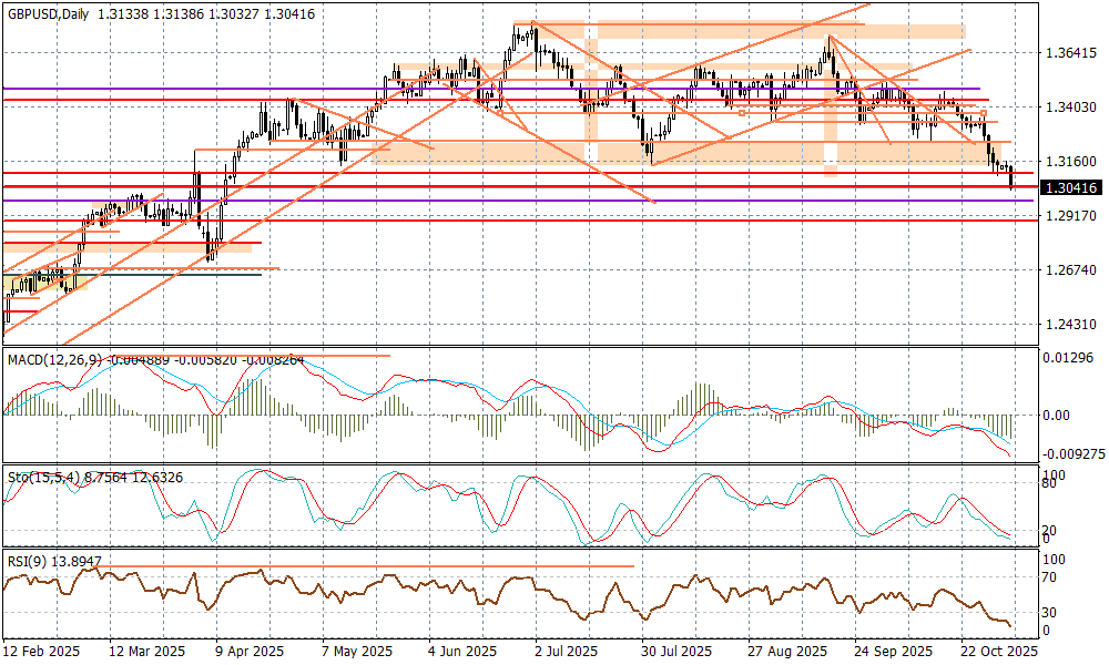 Obecna fala spadkowa na kablu jest już większa od tej z lipca b.r. Naruszenie bariery 1,30 staje się coraz bardziej prawdopodobne, ale mocniejsze wsparcia można zlokalizować wokół 1,2970-80.