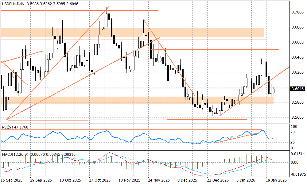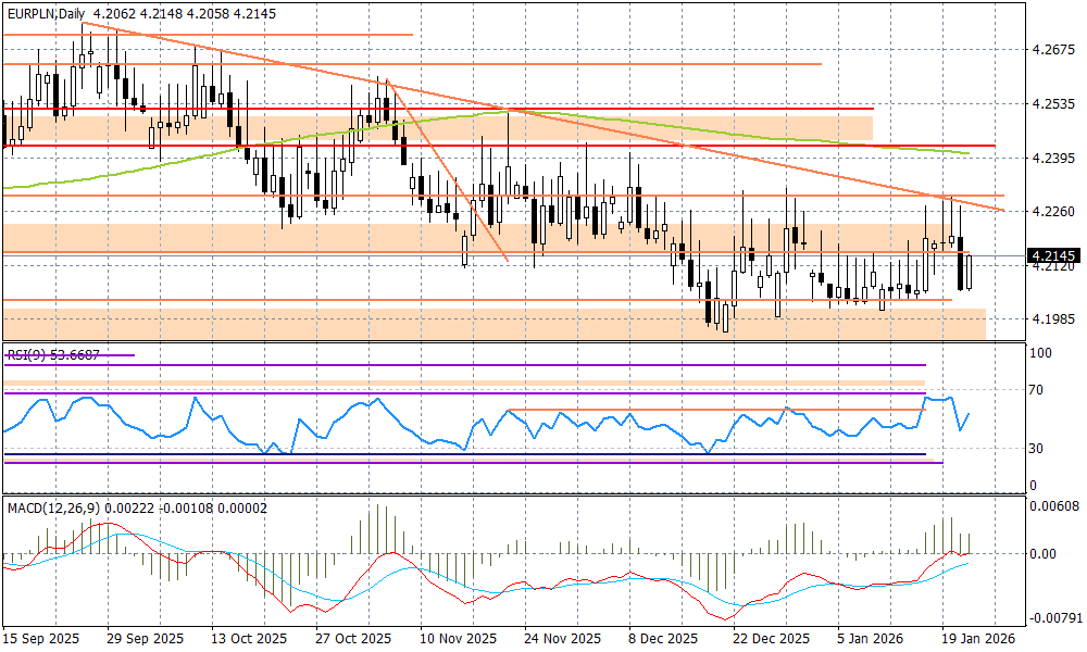 Spotkanie światowych liderów przy okazji Forum Ekonomicznego w Davos okazało się być dość produktywne. Eskalacji dalszego impasu pomiędzy USA, a Unią Europejską w temacie Grenlandii zapobiegł sekretarz generalny NATO, Mark Rutte, który zaproponował Donaldowi Trumpowi kompromisowe rozwiązania zwiększające bezpieczeństwo USA, przy jednoczesnym zachowaniu jedności NATO. Amerykanie dostaną zgodę od Duńczyków na zwiększenie liczby baz wojskowych, które będą traktowane na zasadzie eksterytorialności, tak jak brytyjskie bazy wojskowe na Cyprze. W odpowiedzi prezydent USA zapowiedział wycofanie karnych ceł za Grenlandię, które miały wejść w życie 1 lutego. Temat, który pojawił się w weekend i mocno wstrząsnął rynkami, szybko wypadł z wokandy. Efekt TACO, czy spryt i doświadczenie dyplomatyczne europejskich polityków, którzy zagrali mocnymi kartami wobec USA? A może jedno i drugie? Niesmak pozostał jednak na rynkach. Wall Street wprawdzie wymazała już sporą część spadków, ale inwestorzy zdaje się, że nie wiedzą co zrobić dalej z dolarem... EURUSD pozostaje względnie wysoko, chociaż już poniżej poziomu 1,17.