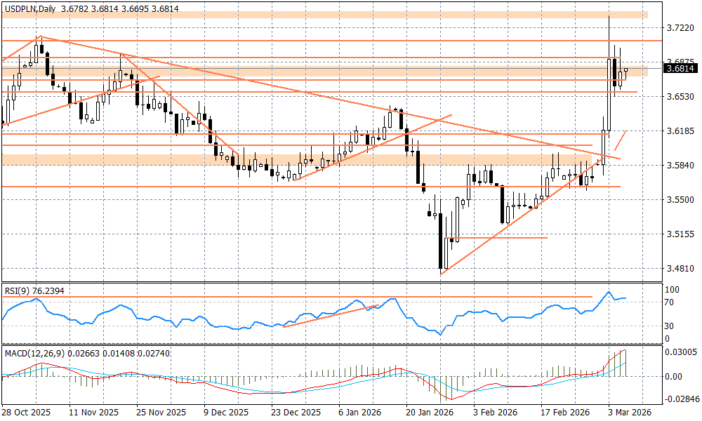 Pomimo nadal drożejącej ropy naftowej na światowych rynkach i większej nerwowości na Wall Street w czwartek, sytuacja na walutach się nieco uspokoiła. W piątek rano EURUSD jest kwotowany przy 1,16, po tym jak wczoraj wieczorem popyt zdołał wyciągnąć notowania z okolic 1,1550 - to sygnał, że przepływy w stronę dolara nieco wygasają. Krótkoterminowo amerykańska waluta reaguje według schematu risk-off (zyskuje)/risk-on (traci). Potrzeba będzie przynajmniej kilka tygodni, aby ten schemat zaczął zmieniać się w stronę reakcji dolara w ślad za indeksami Wall Street, które średnioterminowo mogą zachowywać się lepiej, niż ich odpowiedniki w Europie, Azji, czy na rynkach wschodzących. Podobnie ma się sprawa z korelacją amerykańskiej waluty z danymi makroekonomicznymi, które ostatnio wypadały nieźle - w tym tygodniu indeksy ISM, ADP, cotygodniowe bezrobocie, a dzisiaj czeka nas sprzedaż detaliczna i odczyty Departamentu Pracy - to o godz. 14:30. Brak bezpośredniego odniesienia się rynków do tych danych to sygnał, że inwestorzy mają trudności z ich interpretacją - to, że amerykańska gospodarka jest silna, to widać, ale czy taka pozostanie też w kolejnych miesiącach, jeżeli zawirowania na Bliskim Wschodzie wpływające już na notowania surowców energetycznych będą trwać nadal i doprowadzą do jej spowolnienia? Trudno jest w obecnej sytuacji zastosować tu jakieś konkretne miary do oceny (gdyż sytuacja geopolityczna pozostaje dość dynamiczna), ale pewne jest jedno - skoro teraz USA są silne, to wojna z Iranem nie spowoduje, że zobaczymy recesję (co najwyżej niewielkie spowolnienie). Inna sprawa, że ten konflikt będzie musiał zakończyć się negocjacjami. Doniesienia wywiadowcze wskazują, że pozycja reżimu w Iranie pozostaje silna i scenariusz oddolnej rewolucji jest mało realny. To rozumie też sam Donald Trump, który stwierdził w czwartek, że Irańczycy wysyłają sygnały, że chcą rozmawiać, ale on uważa, że jest na to jeszcze za wcześnie. Narracja Izraela (na bazie doniesień medialnych) idzie w stronę presji na maksymalne osłabienie siły militarnej przeciwnika ("wybicie zębów"), zanim takie rozmowy byłyby możliwe. Wracając do Trumpa - dał on do zrozumienia, że chciałby, aby USA miały wpływ na wybór osoby (z reżimu?), która dawałaby gwarancje stabilizacji kraju. Temu wszystkiemu mocno zaprzecza (na razie?) sam Iran, ale ten wątek "wisi w powietrzu" i jest to jeden z kluczowych powodów dla którego rynki nie są dzisiaj tak nerwowe. Niewykluczone, że po weekendzie inwestorzy mogą zacząć mocniej grać tym tematem, nastawiając się na "odliczanie" do zakończenia tej wojny (jakkolwiek irracjonalnie może to brzmieć biorąc pod uwagę "szarpanie" się Iranu w temacie działań odwetowych).