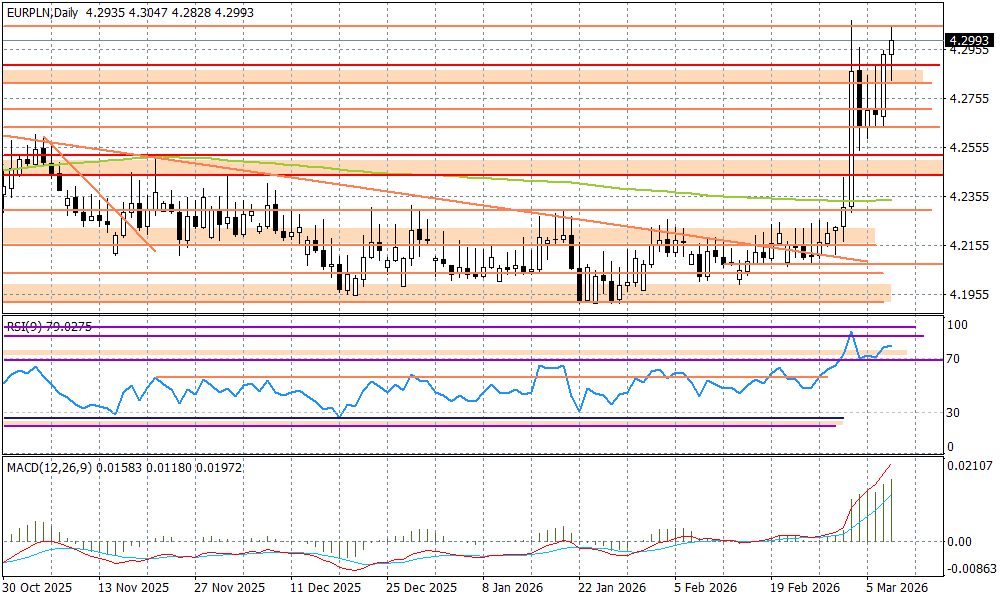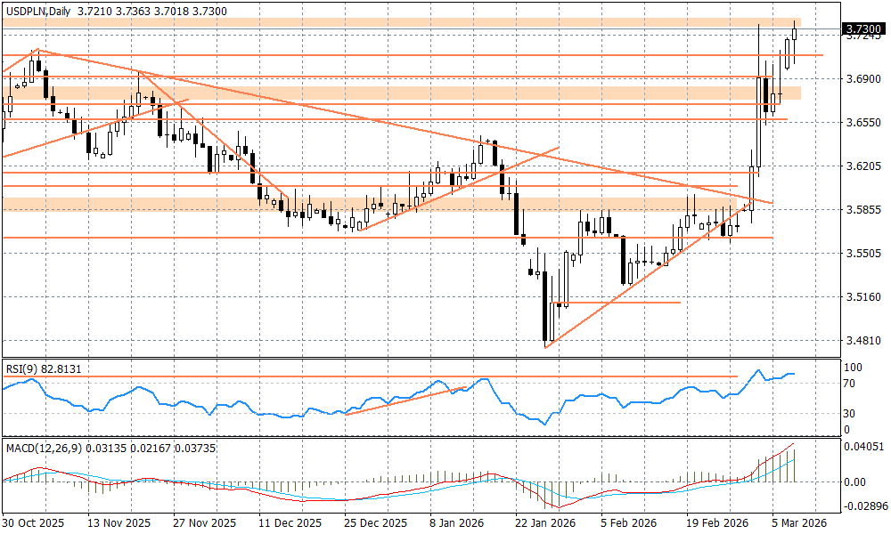 Dolar na rynkach światowych dzisiaj nadal zyskuje, ale widać wyraźnie, że najmocniej obrywają waluty rynków wschodzących, co pokazuje utrzymujące się ogromne napięcia, ale i też szybko rosnące obawy, że droga ropa doprowadzi nie tylko do wyższej inflacji, ale i też kryzysu gospodarczego. Pośród głównych par walutowych najsilniej reaguje EURUSD zbliżając się w stronę 1,15. To wszystko przekłada się na sytuację wokół złotego - EURPLN naruszył rano poziom 4,30, a USDPLN rejon 3,73. Z technicznego punktu widzenia mamy, zatem powrót w rejony minimów z ubiegłego tygodnia, a nawet ich naruszenie. Co dalej? Wiele będzie zależeć od tego czy strony bliskowschodniego konfliktu usiądą do stołu rozmów, co pozwoliłoby wyciszyć nastroje na rynkach i skorygować ostatnie ruchy.