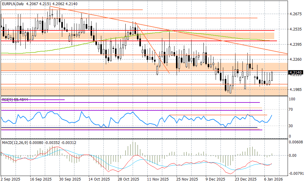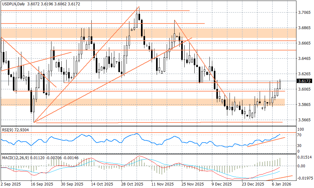 Na globalnym rynku obserwujemy dalsze umocnienie dolara, które przekłada się na zachowanie USDPLN. Para rośnie w piątek rano w okolice 3,62, co jest już wyraźnym wybiciem bariery 3,60, która była naruszona w ostatnich dniach. Złoty traci też względem innych walut - EURPLN rośnie do 4,2150 zł, a CHFPLN do 4,5230, choć tutaj ruch jest bardziej kosmetyczny. Wciąż czekamy, zatem na mocniejszy impuls, który mógłby "zatrząść" rynkami. W wątku światowej geopolityki do Wenezueli zaczyna dołączać Iran - Donald Trump powiedział, że USA mogłyby interweniować w tym kraju, gdyby tamtejsze władze zaczęły brutalnie tłumić obserwowane od kilku dni masowe demonstracje - ale i też nadal otwarta pozostaje karta ukraińska, która w znacznie większym stopniu wpływa na złotego. Dzisiaj mamy dwa mocne punkty w globalnym kalendarzu - to dane Departamentu Pracy USA za grudzień o godz. 14:30, które mogą okazać się "niezłe" i w efekcie rynki zaczną mniej wierzyć w to, że FED mógłby w tym roku bardziej zdecydowanie ciąć stopy procentowe (choć i tak już to "gołębie" nastawienie gaśnie), oraz potencjalny wyrok Sądu Najwyższego USA ws. ceł o godz. 16:00, który może "mocno zatrząść" podejściem do ryzyka. Cła mogły być nielegalne - jeżeli tak orzekną sędziowie - to może to na kilka tygodni wywrócić globalne relacje gospodarcze wprowadzając niepewność i chaos. To może zaszkodzić relacjom wokół walut EM i podbić dolara.
