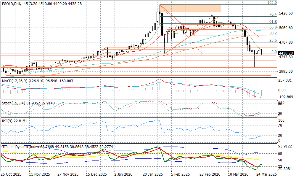 Niejasne perspektywy, co do rozmów pokojowych z Iranem (agencja Axios pisze powołując się na źródła w Białym Domu, że trwają intensywne przygotowania do operacji lądowej) powodują, że inwestorzy nie są pewni, co do Trump-put.... dolar dzisiaj zyskuje, cofnęły się giełdy, podrożała ropa i potaniało złoto. Reakcja na kruszcu wpisuje się w ostatnich dniach w krótkoterminowy schemat risk-on/risk-off. To może sugerować, że albo w rejonie 4100 pkt. (minimum na kontraktach w poniedziałek) mieliśmy mocny dołek - będzie tak, jeżeli finalnie w kwestii Iranu będziemy zmierzać w stronę zawieszenia wojny - albo zostanie on naruszony (jeżeli po weekendzie mielibyśmy realną perspektywę eskalacji).