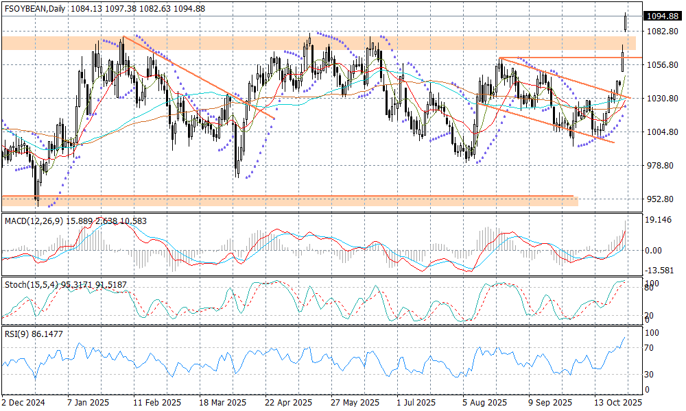Notowania kontraktów na amerykańską soję znalazły się na najwyższych poziomach od lipca 2024 r. wybijając jednocześnie z dużym impetem dotychczasową strefę oporu przy 1060-1080 USD. Rynek bardzo pozytywnie zareagował na weekendowe doniesienia o umowie ramowej pomiędzy USA, a Chinami, która będzie przedmiotem czwartkowych rozmów prezydentów Trumpa i Jinpinga. Elementem umowy ma być wznowienie zakupów amerykańskiej soji przez stronę chińską, choć szczegóły nie są znane.
