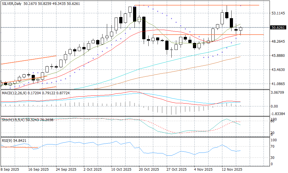 Futures na srebro odbiły dzisiaj od wsparć przy 49,45 USD i po południu wróciliśmy wyraźnie ponad poziom 50 USD. Co ciekawe ruch ten nie korelował ani z osłabieniem dolara, czy też odbiciem na Wall Street (jest dokłądnie odwrotnie). Ruch ten może mieć bardziej związek ze stabilizacją cen złota - futures ponad 4000 USD.