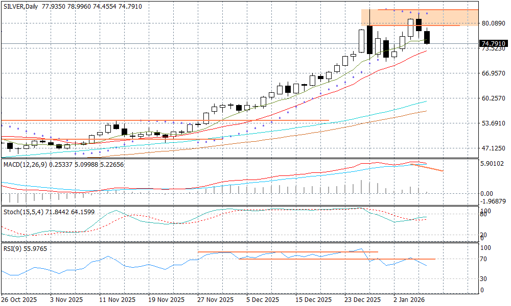 Czwartek przynosi kontynuację ruchu ze środy, który może inicjować formację podwójnego szczytu na srebrze. Ogólnie korektę widać też na innych kruszcach, w tym na złocie. Inwestorzy widzą preteksty do realizacji zysków po tym, jak kontekst Wenezueli nie podbił dalej ryzyka geopolitycznego, ale i też ze względu na inne tematy, jak chociażby ryzyko umocnienia dolara i fali risk-off, jeżeli Sąd Najwyższy ogłosi, że cła wprowadzone przez Donalda Trumpa w zeszłym roku są nieważne. Teoretycznie wyrok w tej sprawie może zapaść już jutro o godz. 16:00, choć nie jest to przesądzone - rynki spodziewają się go jednak jeszcze w tym miesiącu.