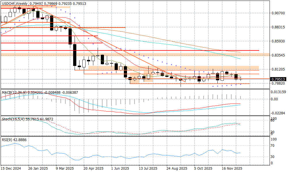 Para USDCHF jest w trendzie bocznym od lipca b.r. Aspekty związane z wahaniami rynków, co do polityki FED-u znoszą się z tym, co inwestorzy spekulują na temat ruchów SNB. Teoretycznie układ sił jest negatywny - FED jest w cyklu obniżek stóp, podczas, kiedy SNB uderzył w podłogę (stopy 0,00 proc.) już kilka miesięcy temu. Teraz dyskusja tyczy się tylko tego, czy mogą być one ujemne w 2026 r. Na ostatnim posiedzeniu szwajcarscy decydenci przyznali, że sytuacja gospodarcza jest niezła (podwyższono prognozę PKB na 2026 r.), a inflacja pozostanie niska (0,2 proc.), co teoretycznie mogłoby zostać odebrane, jako przesłanka do stabilizacji stóp. Ale SNB będzie "lawirował", tak aby osiągnąć efekt "gołębiego" przekazu. Silny frank nie jest w interesie szwajcarskiej gospodarki, choć wprost i głośno się tego nie mówi. Dlatego pomimo ostatnich przekazów z FED/SNB w grudniu, para USDCHF , jakoś nie zeszła mocniej w dół - choć ubiegły tydzień, kiedy to wspomniane banki centralne miały swoje posiedzenia, był spadkowy.