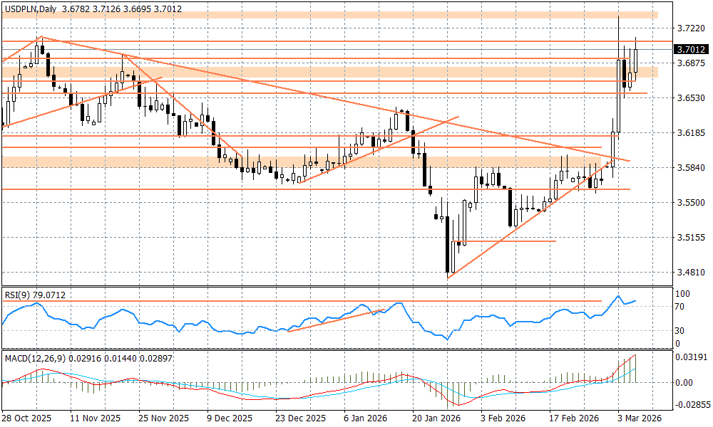 Drożejąca ropa podbija dolara (risk-off), co ściąga EURUSD w dół, choć do testu minimum ze środy przy 1,1530 zostało jeszcze nieco miejsca. To jednak wystarcza do tego, aby USDPLN powrócił ponad poziom 3,70.