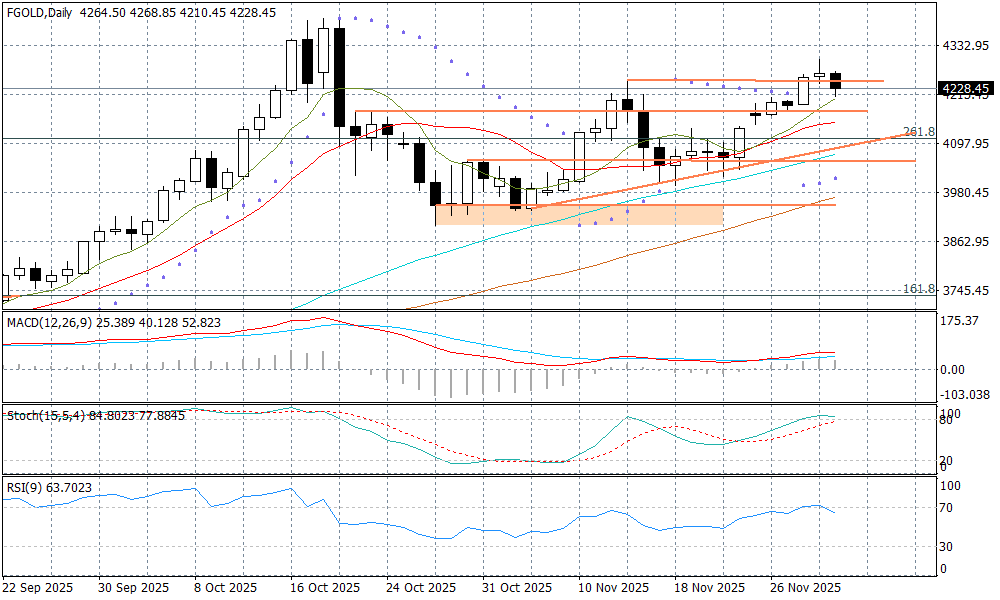 Wtorek przynosi nieznaczne cofnięcie się kontraktów na złoto, co rynkowi obserwatorzy przypisują realizacji zysków po sporych zwyżkach z ostatnich dni. Uwagę zwraca też lekkie umocnienie dolara. W szerszym kontekście narracja jednak nadal sprzyja zwyżkom, a wybicie na nowe ATH powyżej 4400 USD na kontraktach na złoto, wydaje się być kwestią czasu. Rynek podtrzymuje oczekiwania, co do obniżki stóp przez FED 10 grudnia, a także wyraża obawy związane z możliwą nominacją Kevina Hassetta na nowego szefa FED.