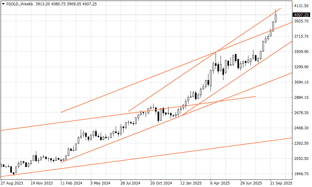 Po przebiciu bariery 4000 USD na złocie, trend wzrostowy zaczął przyhamowywać. W czwartek po południu mocniej zeszliśmy poniżej tej bariery, co można wiązać z pogorszeniem klimatu wokół ryzykownych aktywów po doniesieniach z Chin w temacie ograniczeń eksportu metali ziem rzadkich. Piątek przynosi próbę podbicia, co nie zaskakuje biorąc pod uwagę siłę kruszców w ostatnim czasie i narrację idącą w efekt FOMO (strach przed ucieczką rynku w górę). Wydaje się, że przyszły tydzień może upłynąć pod znakiem podwyższonej zmienności, co będzie też sygnałem wchodzenia rynku w fazę konsolidacji z nieraz głębszymi korektami poniżej 4000 USD.