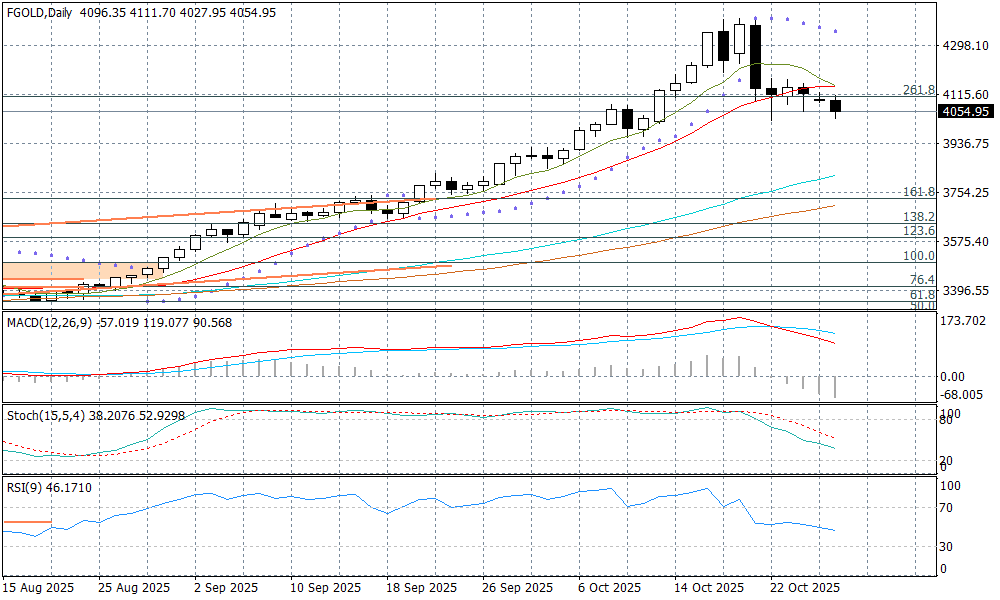 Skoro USA i Chiny porozumiały się, co do ram umowy handlowej, jaka będzie podpisana w czwartek przez prezydentów USA i Chin (temat restrykcji w eksporcie metali ziem rzadkich został odroczony o rok), to rynki zinterpretowały to na niekorzyść tzw. bezpiecznych przystani do których zalicza się też złoto. Niemniej spadki futures na kruszec nie są aż tak duże - rynek nie przetestował dołków z 22 października przy 4021 USD. Zarazem pozostajemy ponad barierą 4000 USD.