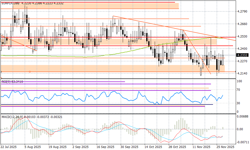 Opublikowane rano szacunki Głównego Urzędu Statystycznego dotyczące listopadowej inflacji CPI mogą wskazywać na większe szanse, co do cięcia stóp przez Radę Polityki Pieniężnej na posiedzeniu już w najbliższą środę, 3 grudnia. Za sprawą wyhamowania w relacji rocznej do 2,4 proc. r/r, wskaźnik cen znalazł się w celu banku centralnego (2,5 proc.), a pomimo kilku cięć stóp procentowych w tym roku nominalna stopa procentowa wynosi 4,25 proc. To powoduje, że zawężenie tzw. realnych stóp procentowych jest jak najbardziej zasadne, choć to, czy stanie się tak już za kilka dni, nie jest takie oczywiste. Opublikowane wcześniej dane makro niejako podbijają stawkę, co do tempa wzrostu gospodarczego, które w IV kwartale może przekroczyć 3,7 proc. r/r odnotowane w okresie lipiec-wrzesień. Gospodarka rosnąca w tempie bliskim, lub przekraczającym 4,0 proc. r/r może zniechęcać RPP do nadmiernego luzowania, zwłaszcza gdyby dodatkowo jej motorem była szybko rosnąca konsumpcja. Z drugiej strony RPP może mieć więcej danych potrzebnych do szacunków wzrostu PKB w połowie stycznia, co może zniechęcać do cięcia na posiedzeniu 12 stycznia właśnie kosztem ruchu 3 grudnia. Gdyby do niego rzeczywiście doszło, to złoty mógłby krótkookresowo stracić na wartości.