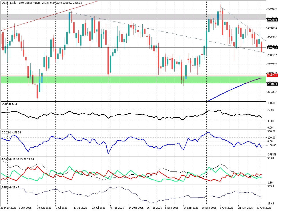 Kontrakty terminowe DAX-a wywierają presję na dolne ograniczenie formacji klina 23950 – 24246 punktów, gdzie przebiega przełamana linia poprzedniej zależności spadkowej. Nadal mamy także ramy konsolidacji 24578 – 23316 pkt., więc narastanie korekcyjnej, spadkowej zależności nieco niepokoi byki, ale nie wywiera mocnego impulsu na średni termin. Zauważmy, że wczoraj gra toczyła się na Wall St wokół spółek MAG-7, niemniej dzisiejsze schłodzenie na nowojorskich futures rzędu 0,4%/1,1% wymusza również cofnięcie na DE40. W Europie opublikowano wczoraj obiecujące, wyprzedzające wskaźniki ekonomiczne m.in. ds. zakupów przemysłowych. To poprawiło nastroje w strefie euro. Z tego względu inwestorzy stali się nieco bardziej tolerancyjni na ryzyko a DAX zyskał wczoraj +0,73%. Widać było ożywienie w europejskim sektorze motoryzacyjnym, który skorzystał z nadziei na rozwiązanie problemów z dostawami u producenta chipów Nexperia. Chiński rząd obiecał wcześniej eksport pilnie potrzebnych półprzewodników. W związku z tym wiele akcji spółek motoryzacyjnych odnotowało ponadprzeciętne zyski. Przy czym wczorajsze podbicia mieszają się z dzisiejszym schłodzeniem futures, co kreuje podwyższone, rynkowe ryzyko dla akcji z Niemiec. Według technicznego spojrzenia DE40 mają momentum hossy wg SMA-200 (ok. 23449 pkt.), więc przebicie w dół strefy popytowej 23950 – 23785 pkt. powinno wymuszać retest tej średniej. Z kolei złamanie na północ TL 24246 pkt. najpierw powinno skutkować retestem 24578 pkt. a jego przebicie otworzy opcję ruchu do ATH. Gracze mają zatem całą paletę szykowanych atrakcji na futures DAX-a, niemniej muszą zwiększyć czujność i ostrożność z uwagi na kreowaną korektę spadkową dla Wall St.