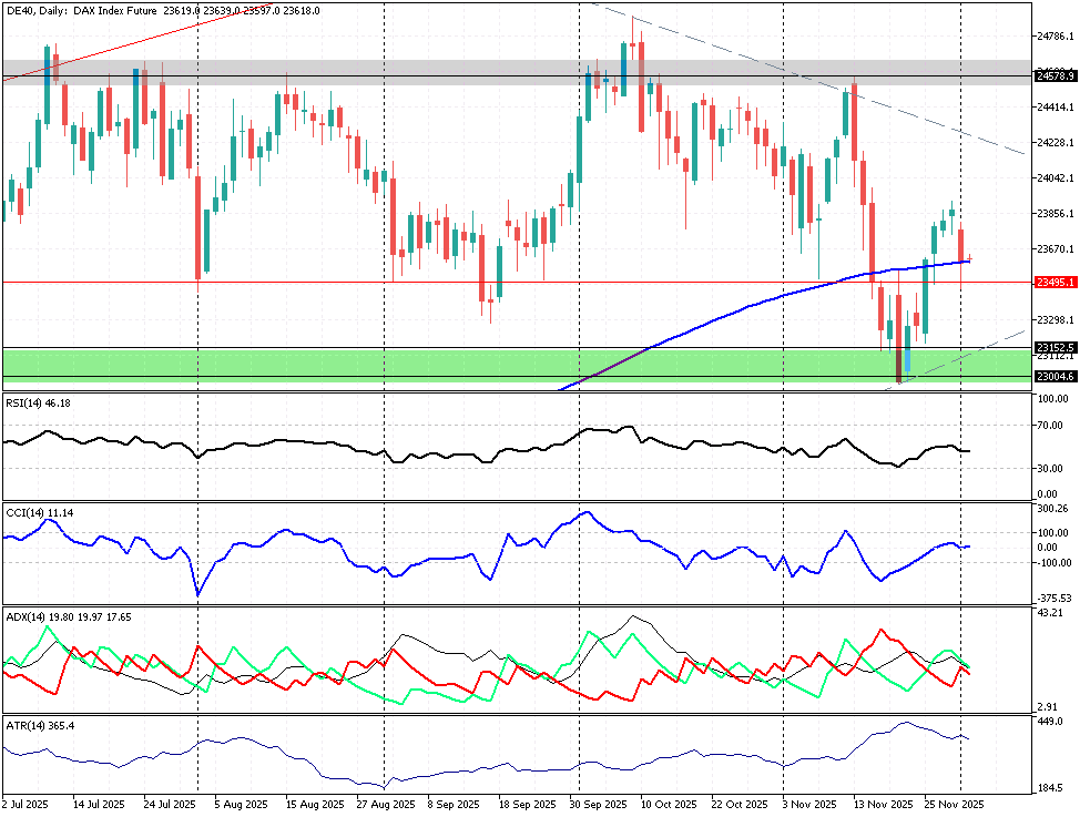 Futures na DAX (+0,07%) nieznacznie zyskują w ramach azjatyckiej sesji w zakresie 23639 – 23597 punktów, będąc po przeszło 18 procentowych wzrostach w perspektywie year-to-date. Obecnie trwa oscylowanie wokół rosnącej SMA-200, choć CCI (14) czy RSI (14) nakłaniają byki do zwiększenia ostrożności. Według miary DMI / ADX mamy na DE40 trend boczny i nic nie zapowiada jakiejś silniejszej fali kierunkowej. Najpierw musiałoby się zmienić zogniskowanie price action wobec pivotu ok. 23495 pkt., abyśmy zaczęli dopatrywać się na wykresie dziennym przeważania podażowego. Stąd średnie 365 pkt. wahania wg ATR (14) na sesję należy obecnie brać pod uwagę za szacowanie standardowego ryzyka w aktywowanej ostatnio formacji technicznej złotego krzyża hossy. Nie wolno jednak pominąć faktu, iż inwestorzy coraz częściej uwzględniają w cenach obniżkę stóp procentowych przez Rezerwę Federalną w grudniu, powołując się na słabsze dane gospodarcze w USA i zmniejszającą się presję inflacyjną. Pamiętajmy zatem o możliwych ww. wahaniach futures DAX w ramach rynku byka i nie wolno zapominać, że nawet w tak klarownym układzie raz na czas mogą pojawiać się pułapki hossy wobec szacunkowych pivotów 23836 – 23495 pkt.
