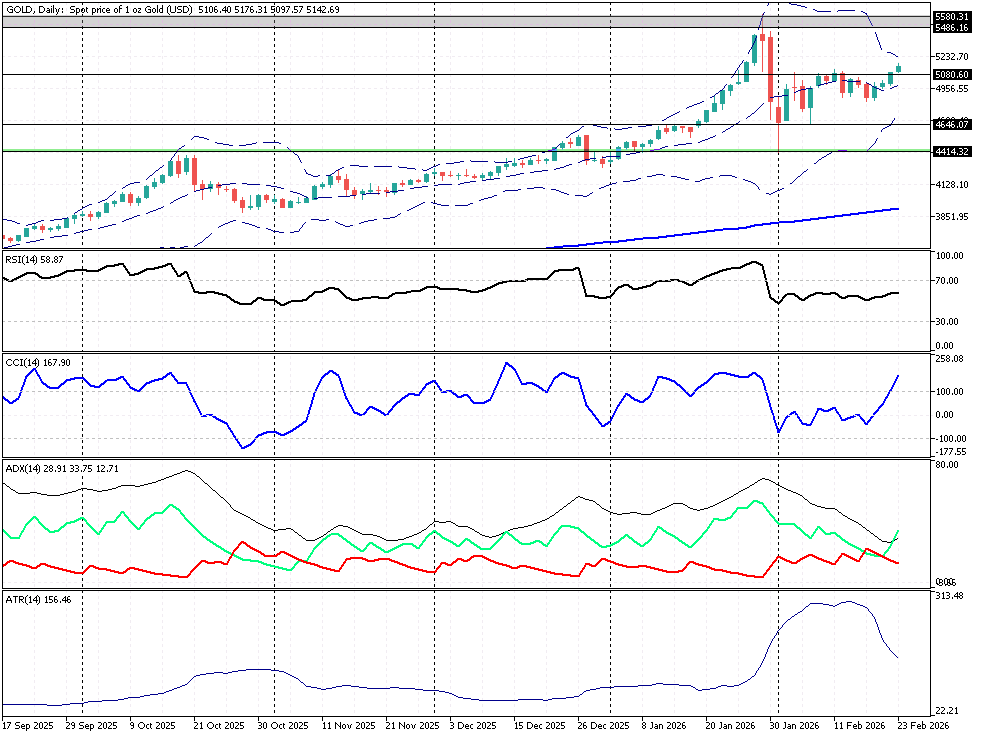 W obliczu narastających napięć handlowych i ryzyk geopolitycznych, kapitał szerokim strumieniem płynie w stronę rynku złota, windując kurs na miesięczne szczyty. Słabnący dolar oraz rynkowe spekulacje dotyczące cięć stóp procentowych przez Fed stanowią silny fundament pod obecny rajd. Do tego nowe 15-procentowe cła globalne Donalda Trumpa oraz spowolnienie PKB USA do poziomu 1,4% drastycznie zwiększyło popyt na aktywa typu safe-haven. GOLD notuje czwartą wzrostową sesję z rzędu, reagując na ryzyko konfliktu z Iranem oraz niepewność wokół globalnych łańcuchów dostaw. Analiza techniczna wykresu dziennego potwierdza, że GOLD skutecznie broni wsparcia w okolicach 5080 $, co otwiera drogę do dalszej aprecjacji. Szerokie wstęgi Bollingera sygnalizują powrót wysokiej zmienności, premiując aktywnych graczy rynkowych. Wskaźnik RSI na poziomie ok. 59 pkt. sugeruje, że rynek ma jeszcze sporo miejsca do wzrostów przed wejściem w strefę wykupienia. Jednocześnie sygnalna CCI o wartości 170 pkt. potwierdza silną dominację popytu i agresywne nastawienie byków. Natomiast ADX utrzymujący się powyżej 28 punktów wskazuje na stabilny trend, który nie wykazuje jeszcze oznak wyczerpania. Kluczowym zadaniem dla strony popytowej jest teraz trwałe utrzymanie notowań powyżej bariery 5100 $. Ewentualna korekta w stronę 4859 $ byłaby jedynie subtelnym przystankiem przed próbą ataku na historyczne maksima. W obecnej narracji rynkowej GOLD pozostaje bezkonkurencyjnym aktywem defensywnym, zyskującym na globalnej niepewności.