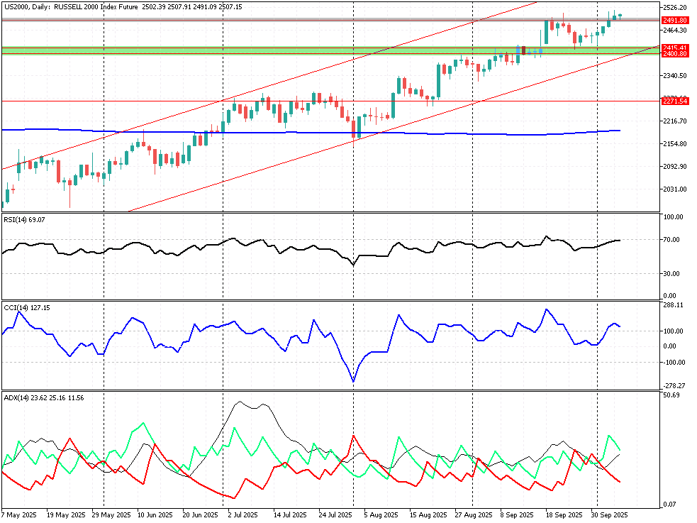 Nowojorskie futures lekko odbijają po azjatycko – europejskich wymianach, zapowiadając +0,14%/+0,26% na głównych indeksach na otwarciu kasowego. Z pewnością mamy stan wyczekiwania na ważniejsze decyzje wokół częściowego zamknięcia rządu USA. Senat, w którym większość stanowią Republikanie, po raz piąty odrzucił konkurencyjne środki finansowania agencji federalnych. Nadal mamy impas decyzyjny w Kongresie dot. finansowania rządu, co doprowadziło do częściowego zawieszenia działalności rządu federalnego, znanego jako shutdown. Pamiętajmy także, że inwestorzy oczekują, że FED dokona kolejnych obniżek stóp procentowych do końca roku. Narzędzie CME FedWatch sugeruje, że rynki wyceniają obecnie 94% prawdopodobieństwo obniżki stóp procentowych przez Fed w październiku i 84% prawdopodobieństwo kolejnej obniżki w grudniu. Dzisiaj mamy także w kalendarzu przemówienia członków FOMC tj. Michelle Bowman, Raphael Bostic, Stephen Miran i prezes Fed w Minneapolis Neel Kashkari. Zauważmy także, iż US500 (YTD: +14,6%) stabilizują się ponad wsparciem 6756 pkt. a jego przebicie mogłoby oznaczać szerszą aktywację podaży dla Wall St. Warto pamiętać o tym poziomie przy śledzeniu szarży byków, posilanych optymizmem wokół AI. Z kolei futures dla Russell’a są w bardziej stonowanym położeniu, gdyż nie mają w swoim składzie roszad „siedmiu wspaniałych” a od początku 2025 roku rosną o ok. 11,4%. Stąd zejście poniżej 2491 pkt. powinno wykrystalizować korektę spadkową szerokiej Wall St. Z drugiej strony wskaźnik DMI / ADX nic takiego nie sugeruje, pozwalając stawiać na rozpędzające się momentum rynku byka. Gracze powinni jednak zachować ostrożność, gdyż wskaźniki RSI / CCI (14) są przy wygórowanych poziomach z oznakami lekkiej dywergencji. Ważny opór dla US2000 wypada przy ok. 2577 pkt.