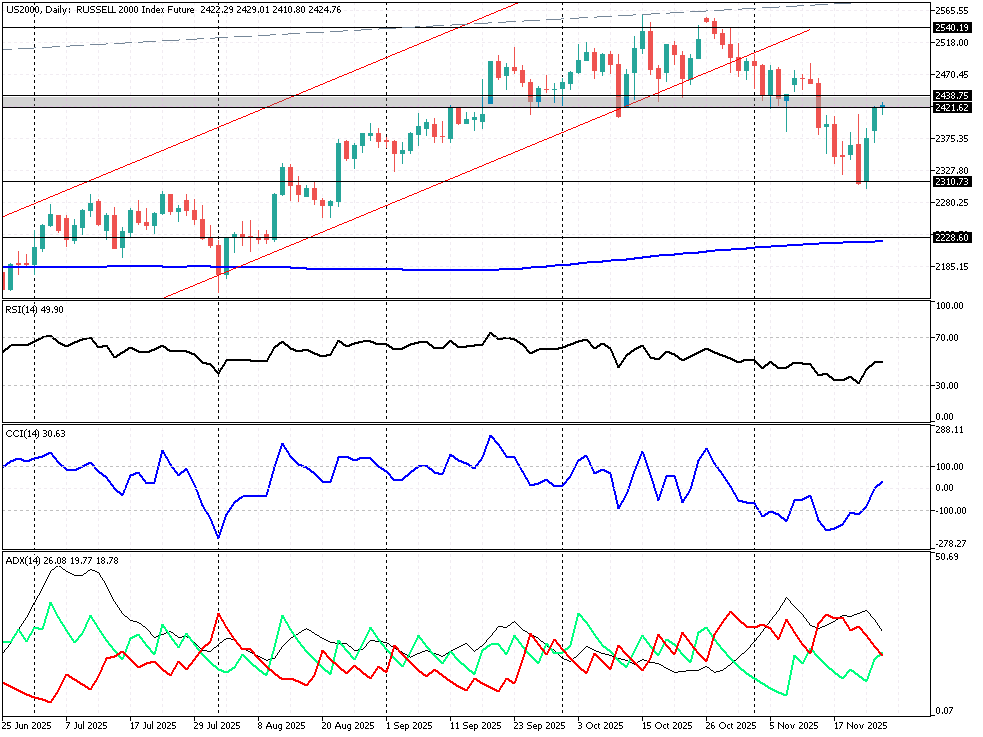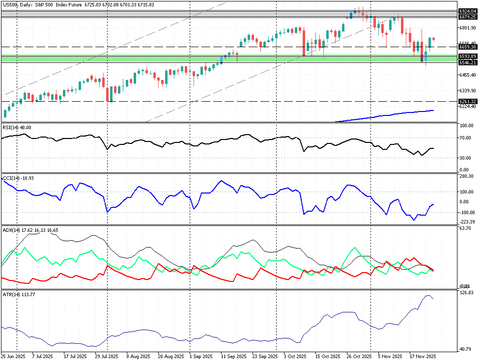 Amerykańskie akcje szykują się przed sesją do stabilizacyjnego otwarcia, ponieważ główne pochodne na indeksy z Wall St. wahają się od -0,25% do +0,05%, przy 0,08% osłabieniu indeksu dolara. Inwestorzy podtrzymują ostrożnościowe podejście pomimo ocieplenia wokół AI i przy odnowionym nadziejom na obniżkę stóp procentowych przez Rezerwę Federalną. Futures na S&P500 konsolidują się w wąskim zakresie 6732 – 6701 pkt., natomiast pochodne na RUSSELL 2000 rysują typowe Doji pod oporem 2438 2418 pkt. Jego przełamanie powinno być konsekwencją przegranej niedźwiedzi ze wsparciem 2310 pkt. W przypadku szerszej akcji popytowej zdobycie obszarów ponad wskazanym oporem może wiązać się z pułapką cenową i o tym należy pamiętać przy rozgrywaniu sesji na szerokim rynku akcji z USA. Z kolei na US500 mamy inicjowanie trendu wzrostowego, wrażliwego statystycznie. Niemniej wyjście z ww. konsolidacji górą powinno korespondować z mocną, ilościową zależnością rynków byka, typowych dla miesięcy listopad – grudzień. Przy czym wskazania na RSI / CCI (14) nie wykazują wyraźnego impetu, stąd możliwe są horyzontalne wahania głównej pochodnej na S&P500.