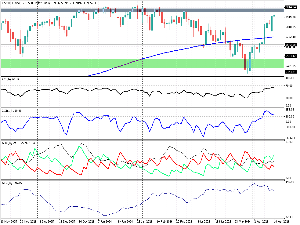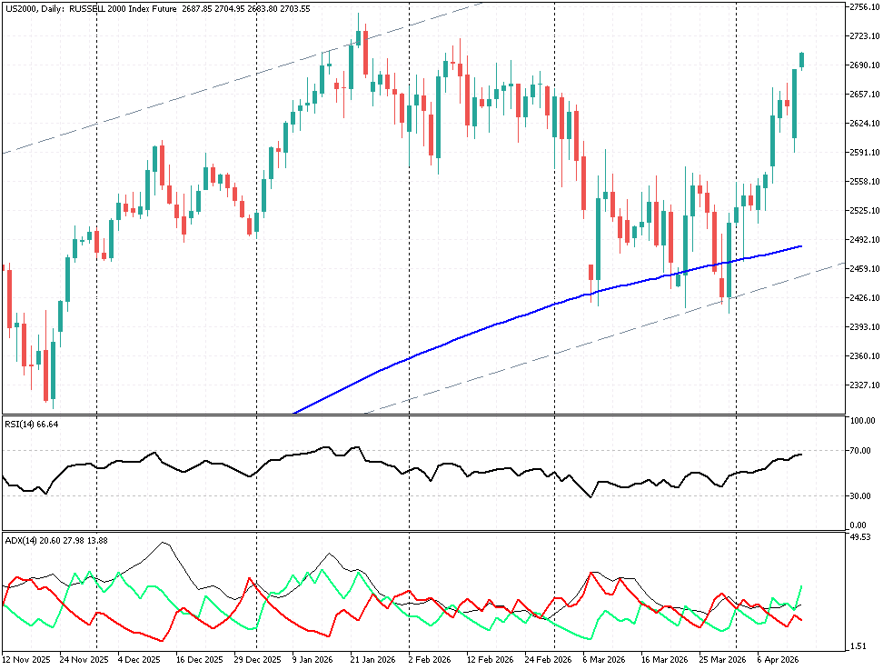 Przed startem Wall Street nastroje pozostają umiarkowanie pozytywne, bo nadzieje na deeskalację napięć między USA a Iranem oraz spadek cen ropy poniżej 100 USD wspierają apetyt na ryzyko. US500 utrzymuje się tuż ponad 6936 pkt i pozostaje blisko kluczowego oporu w rejonie 7015 pkt, a technicznie rynek wspierają RSI 65,17 i dodatni układ DMI, choć ADX 21,13 sugeruje, że trend dopiero się buduje. Jeszcze mocniej wygląda US2000, który handluje przy 2701-2704 pkt i zbliża się do oporu przy 2723 pkt, pokazując relatywną siłę segmentu small caps. Wskaźniki dla Russella również pozostają korzystne, bo RSI wynosi 66,64, a przewaga +DI nad -DI potwierdza kontrolę kupujących. Zmienność w drugiej części dnia może jednak wzrosnąć wraz z publikacją PPI i reakcją rynku na wyniki banków, zwłaszcza po mieszanym odbiorze raportów JPMorgan i Wells Fargo. Krótkoterminowo scenariuszem bazowym pozostaje lekko wzrostowe otwarcie, ale dla utrzymania ruchu potrzebne będzie potwierdzenie wybicia ponad 7015 pkt na US500 i 2723 pkt na US2000.