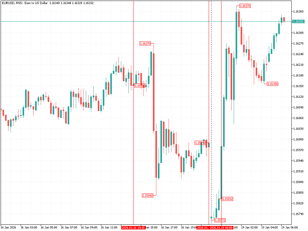 Sesja Azjatycka: W ramach azjatyckiego handlu eurodolar gwałtownie wszedł w impuls wzrostowy w zakresie 1,15772 – 1,16376 USD po tym, jak prezydent USA Donald Trump zagroził eskalacją ceł na osiem krajów europejskich, które sprzeciwiły się jego planom zajęcia Grenlandii. Z kolei AUD/USD rośnie o 0,20%, otrzymując wsparcie ze strony rosnących cen metali (srebro +5,26% d/d, złoto +1,96% d/d).