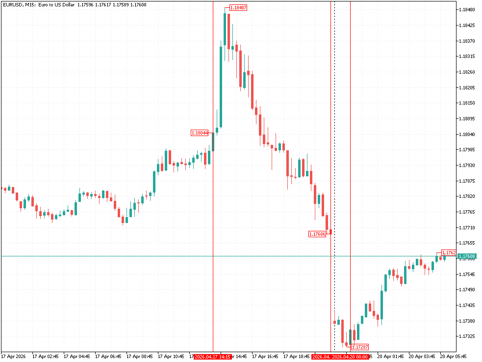 Sesja Amerykańska: Obrót w USA przyniósł podwyższoną zmienność na eurodolarze w zakresie od 1,17686 $ do 1,18487 $. Na rynku utrzymywała się presja sprzedaży amerykańskiego dolara w reakcji na nagłówki geopolityczne. Nadzieje na deeskalację na linii USA–Iran ciążyły na USD po tym, jak Iran zakomunikował ponowne (częściowe) otwarcie Cieśniny Ormuz. Równolegle spadek cen ropy naftowej (blisko -12,5%) złagodził obawy o globalną inflację. Kurs EUR/USD przebił lokalny opór 1,18188 $, wykonując dynamiczny ruch na północ do poziomu 1,18487 $. Następnie doszło do realizacji zysków i powrotu podaży, co sprowadziło notowania w okolice 1,17686 $.