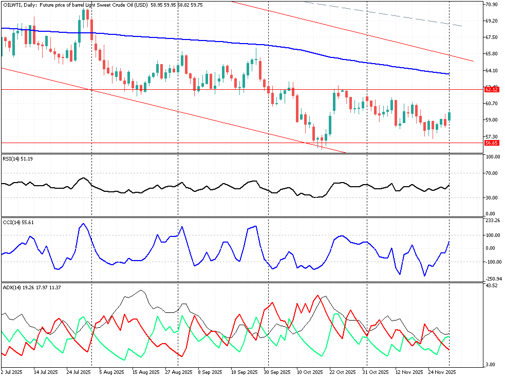 Futures na ropę naftową WTI drożeją o poranku o blisko 2%, gdyż pojawiły się dla byków sprzyjające okoliczności. Otóż OPEC+ potwierdził plan utrzymania dobrowolnych cięć ok. 3,24 mln baryłek dziennie, co najmniej do końca I kwartału 2026 r. Rynek odebrał to jako jasny komunikat o chęci zapobiegania nadpodaży. Kartel uzgodnił również mechanizm oceny maksymalnych zdolności produkcyjnych członków w okresie od stycznia do września 2026 r., co stanowi podstawę do ustalenia kwot bazowych na 2027 r. Zauważmy również, że napięcie USA–Wenezuela (zapowiedź ewentualnego zamknięcia przestrzeni powietrznej przez administrację Trumpa) zagraża eksportowi ok. 0,8 mln brk dziennie wenezuelskiej ropy. Do tego atak dronowy wstrzymał część załadunków z terminala CPC w Noworosyjsku, co chwilowo zatrzymało blisko 1,5 mln brk eksportu rosyjsko-kazachskiej mieszanki. Z kolei ostatni raport API pokazał zaskakujący ubytek zapasów –1,9 mb. Oficjalny odczyt EIA wprawdzie odnotował w tym samym okresie wzrost +2,8 mln brk, jednak całkowite zapasy 426,9 mln brk pozostają o 4 % poniżej pięcioletniej średniej, a Cushing raportuje trzeci z rzędu tydzień spadków. Rynek zinterpretował te dane jako względnie pro-popytowe. Ponadto utrzymuje się słabość na USD Index, gdyż inwestorzy grają pod obniżkę stóp procentowych FED. Z punktu widzenia techniki mamy inicjowanie intratnej dla byków formacji objęcia hossy, gdyż złamanie oporu 59,28 $ zachęca zestaw DMI / ADX i RSI (14) do rozwinięcia zwyżkowego price action na OILWTI. Tym samym byki zerkają na ważny opór 60,50 $, którego przekroczenie powinno wymuszać klasyczny powrót w okolice średniej SMA-200. Na drodze wolnej SMA mamy także TL 62,12 $, stąd warto zachować ostrożność, gdyż cofnięcie się kwotowań OILWTI pod wsparcia 57,65 – 56,65 $ zagroziłoby minimom z kwietnia – maja 2025 roku. Taki scenariusz potencjalnie zwiększyłby ryzyko na futures ropy naftowej, dając zależności kontynuacyjne dla fali bessy (OILWTI 3 lata: ok. -26,3%). Podsumowując krótkoterminowo budowana jest struktura wzrostowa dla OILWTI a rynek dyskontuje mieszankę konserwatywnej polityki OPEC+, realnych zakłóceń eksportu z Rosji i Ameryki Łac., a także lekkiego poluzowania monetarnego w USA. Dopóki WTI broni strefy 57,65 – 56,65 $ to byki mogą czuć się komfortowo, rozgrywając obserwowane ożywienie. Warto pamiętać o 4,3% zmienności, wynikającej z ubiegłotygodniowych wahań OILWTI.