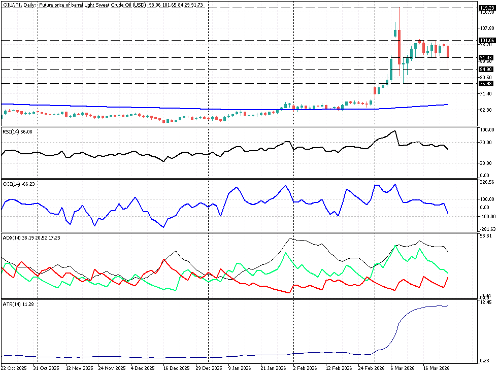 Na wykresie dziennym OILWTI struktura techniczna jest czytelna: po wybiciu z bazy 62–63 USD rynek wykonał dynamiczną falę wzrostową aż do panicznego szczytu w okolicach 119,23 USD, po czym wszedł w fazę korekty i konsolidacji. Aktualnie cena oscyluje w przedziale 84,90 – 101,06 USD, potwierdzając kluczowe wsparcie na poziomie 84,90 – 85,00 USD. Sygnalna RSI w okolicach 56-57 pkt. zneutralizowała wcześniejsze wykupienie, CCI na poziomie -58 pkt. potwierdza krótkoterminowe osłabienie momentum, ale bez sygnału skrajnego wyprzedania – rynek koryguje impuls, nie odwraca trendu. Z kolei ADX powyżej 38 punktów wskazuje, że struktura trendowa pozostaje silna, a ekstremalnie wysoki ATR przekraczający 11 USD jednoznacznie komunikuje: jesteśmy w środowisku sterowanym nagłówkami, gdzie każda świeca może być wydarzeniem samym w sobie. Kluczowe poziomy dla aktywnych graczy są następujące: opór w strefie 98–101 USD to pierwsza bariera, której trwałe wybicie reaktywuje narrację wzrostową i otwiera drogę ku 107,8 USD, a w scenariuszu powrotu pełnej eskalacji – ku historycznym szczytom powyżej 119 USD. Od dołu wsparcia na 91,4 USD, 84,9 USD i 76,9 USD wyznaczają kolejne linie obrony przy dalszym schładzaniu premii geopolitycznej.