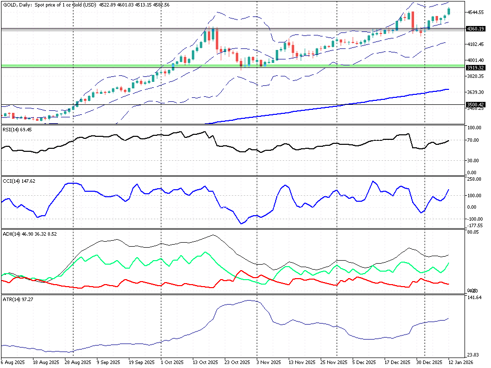 Złoto ustanowiło nowy rekord wszech czasów przy 4601,32 $ za uncję, zyskując w ujęciu dziennym blisko 2%. Inwestorzy nadal traktują kruszec jako „bezpieczną przystań”, ale jednocześnie rośnie wrażliwość notowań na nagłówki polityczne i oczekiwania dot. Fed, co sprzyja krótkoterminowym, dynamicznym ruchom. Impuls wzrostowy jest napędzany przede wszystkim wzrostem awersji do ryzyka: rynki reagują na narastające niepokoje w Iranie oraz ryzyko eskalacji regionalnej po ostrzejszych deklaracjach politycznych. Dodatkowo pojawił się czynnik podbijający popyt na złoto wprost przez FX: wzmożone obawy o niezależność Fed po doniesieniach o działaniach Departamentu Sprawiedliwości wobec banku centralnego osłabiły dolara (USD Index -0,36% d/d), co wsparło szlachetny kruszec. W tle istotne były też słabsze dane z rynku pracy USA, które podbiły spekulacje, że w 2026 r. możliwe będzie dalsze łagodzenie polityki pieniężnej. Rynek GOLD pozostaje w silnym trendzie wzrostowym: ADX(14) ok. 46,9 pkt. potwierdza „trendowy” charakter ruchu, a ATR(14) przy ok. 97 pkt. sygnalizuje podwyższoną dzienną zmienność. Momentum jest wysokie, ale blisko stref „przegrzania”: RSI(14) ok. 70 pkt. oraz CCI(14) przy 152 pkt. wskazują, że popyt dominuje, jednak przestrzeń na korektę techniczną rośnie (zwłaszcza przy braku świeżego katalizatora). Kluczowy opór wpisuje się w rejon 4601 – 4602 pkt. (ATH), natomiast pamiętajmy również o miesięcznym pivocie R2 4730,36 $. Przy czym z punktu widzenia psychologicznego ważną rolę powinno pełnić 5 tys. $ za uncję. Utrzymanie się GOLD poniżej ww. R2 czy też odejście na południe od ATH może kreować konsolidację czy też realizację zysków w obawie o odczyt CPI w USA. Najbliższe wsparcia przebiegają przez okolice 4545 – 4360 $. Niżej ważna pozostaje strefa 4360 – 4278 $ (istotny poziom horyzontalny z wykresu), a w szerszym ujęciu 3919 $ jako kolejny punkt odniesienia dla popytu.