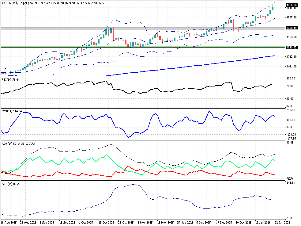 Złoto nieznacznie słabnie po osiągnięciu historycznego szczytu przy 4887,78 $, notując pierwszą sesję spadkową po trzech dniach wzrostów. Kurs kruszcu dryfuje w okolicy 4830 – 4827 $ a za korektą stoi jedno proste zjawisko: aktywacja TACO – "Trump Always Chickens Out" – czyli kolejny odwrót prezydenta USA od własnych groźb taryfowych. Katalizatorem zmiany sentymentu okazało się ogłoszenie Donalda Trumpa z Davos, który po "bardzo produktywnym" spotkaniu z szefem NATO Markiem Rutte ogłosił "ramy przyszłego porozumienia" ws. Grenlandii. W praktyce? Wycofał się z groźby nałożenia 10% ceł na osiem państw europejskich (Norwegia, Szwecja, Francja, Niemcy, UK, Holandia, Finlandia, Dania), które miały uderzyć już 1 lutego 2026 roku. To nie pierwszy raz – Trump wielokrotnie cofał swoje najbardziej ekstremalne groźby taryfowe. Najgłośniej było wiosną ubiegłego roku, gdy ogłosił "nową erę dla gospodarki USA", by następnie zawiesić masową falę ceł. Tym razem prezydent dodatkowo wykluczył siłowe zajęcie Grenlandii, co wywołało globalną ulgę i falę "risk-on" na rynkach.