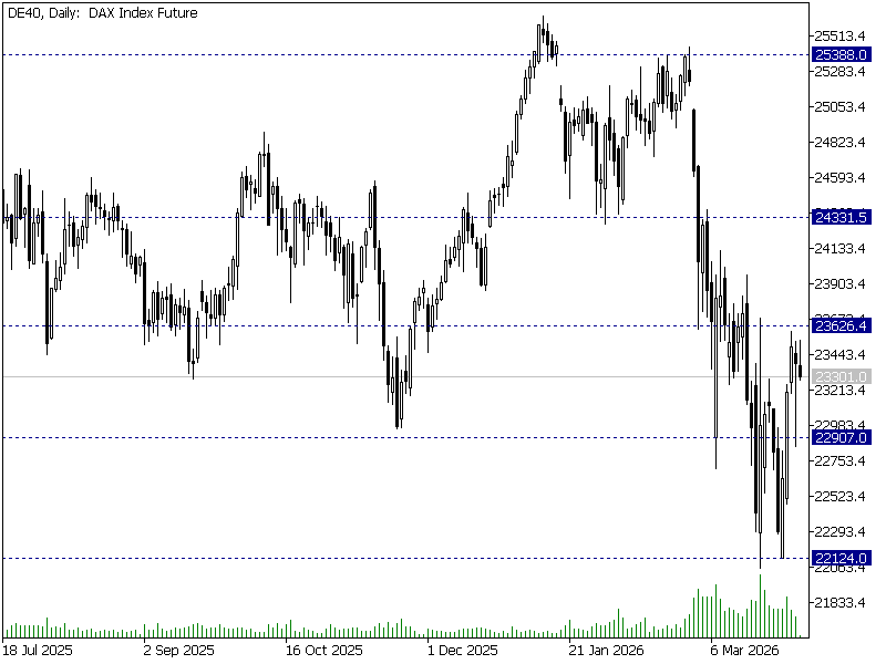 Na wykresie kontraktów futures na DE40 widoczne jest odbicie po wcześniejszym, dynamicznym spadku, a kurs w ostatnich dniach próbuje stabilizować się w rejonie 22900–23300. Jednocześnie notowania pozostają poniżej strefy 23620, która może obecnie pełnić rolę oporu. Notowania w czwartek pozostawały zmienne – indeks ograniczył wcześniejsze spadki i zakończył dzień na poziomie 23387, po doniesieniach o pracach Iranu i Omanu nad porozumieniem dotyczącym bezpieczeństwa transportu w Cieśninie Ormuz, co przejściowo poprawiło sentyment rynkowy.