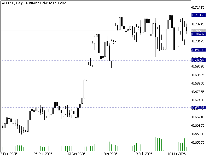 Po wcześniejszym dynamicznym ruchu wzrostowym kontrakty na AUD/USD przeszły w fazę konsolidacji poniżej istotnego oporu w rejonie 0.7136. Kurs cofnął się i obecnie testuje lokalne wsparcie w rejonie 0.7049, pozostając w szerokim przedziale 0.6978–0.7136.