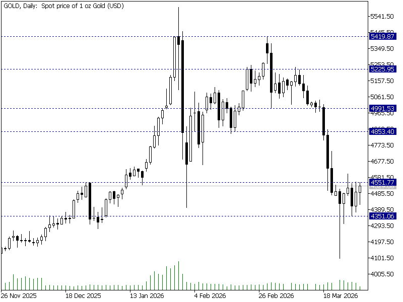 Na początku sesji kontrakty futures na złoto zanotowały wyraźny spadek w okolice 4418 USD. Następnie cena odbiła o około 2,5% i znajduje się w rejonie 4530 USD, ponownie zbliżając się do kluczowego oporu na poziomie 4550 USD.